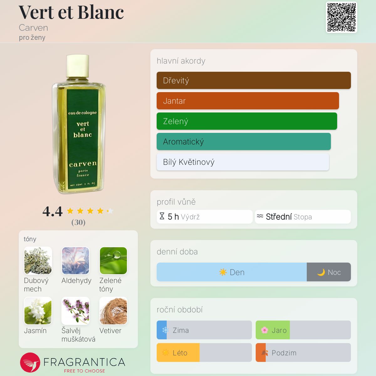 Vert et Blanc podle Carven je Chypre Floral vůně pro ženy. Vert et Blanc byl/a uveden/a v roce 1958. Vrchní tóny jsou Aldehydy, Zelené tóny, Šalvěj muškátová a Galbanum; střední tóny jsouJasmín, Gardénie, Skořice a Ylang-Ylang ; základní tóny jsou Dubový mech, Vetiver, Styrax, Labdanum, Santalové dřevo a Benzoin.