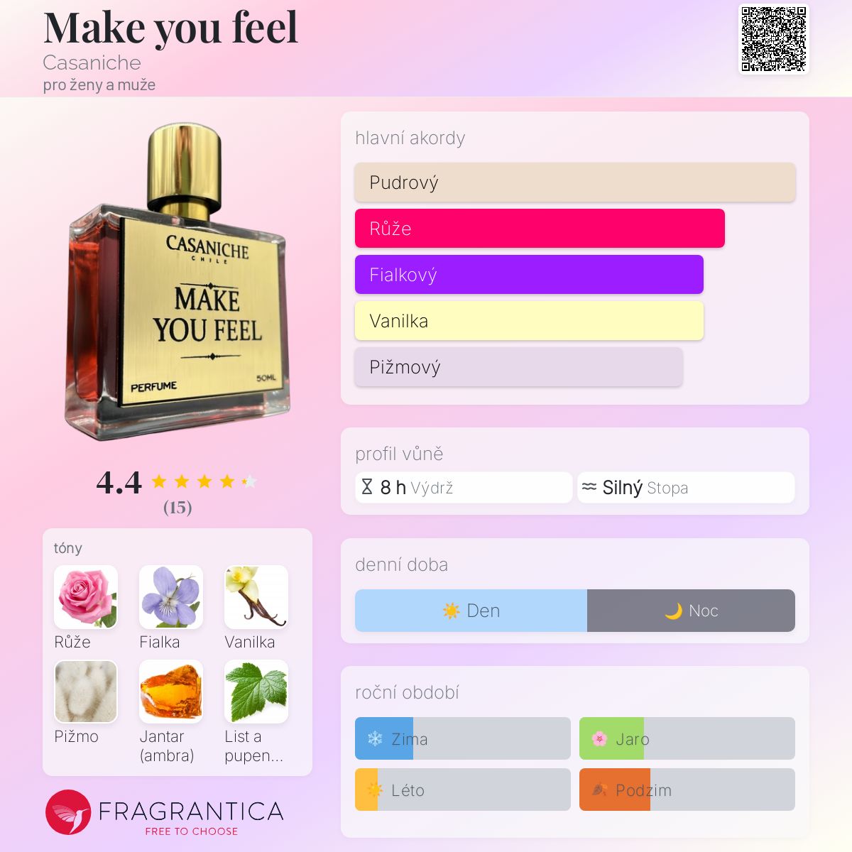 Make you feel podle Casaniche je Floral vůně pro ženy a muže. Make you feel byl/a uveden/a v roce 2023. "Nosem" za touto vůní je Maximiliano Cifuentes. Vrchní tóny jsou Růže, Černý rybíz a Hruška; střední tóny jsouBulharská růže, Damašská růže, Černá růže a Fialka ; základní tóny jsou Damašská růže, Vanilka, Pižmo a Jantar (ambra).