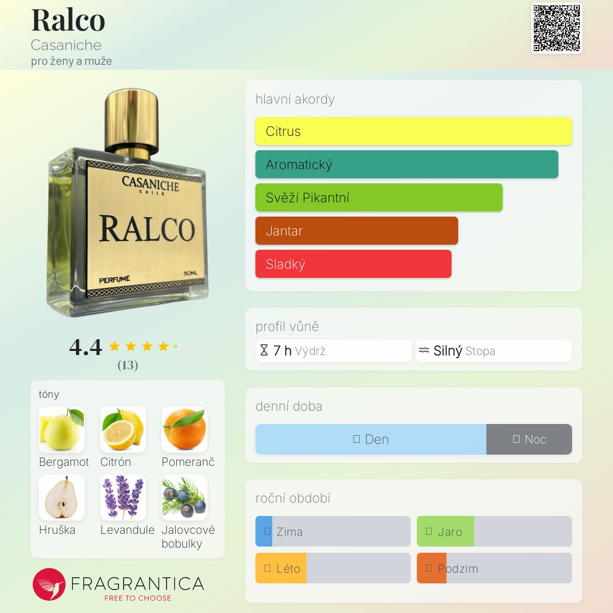 Ralco podle Casaniche je vůně pro ženy a muže. Ralco byl/a uveden/a v roce 2022. "Nosem" za touto vůní je Maximiliano Cifuentes. Vrchní tóny jsou Bergamot, Citrón, Pomeranč, Hruška a Levandule; střední tóny jsouJalovcové bobulky, Tymián a Tráva ; základní tóny jsou Fazole tonka, Ambra, Pižmo a Cedr.