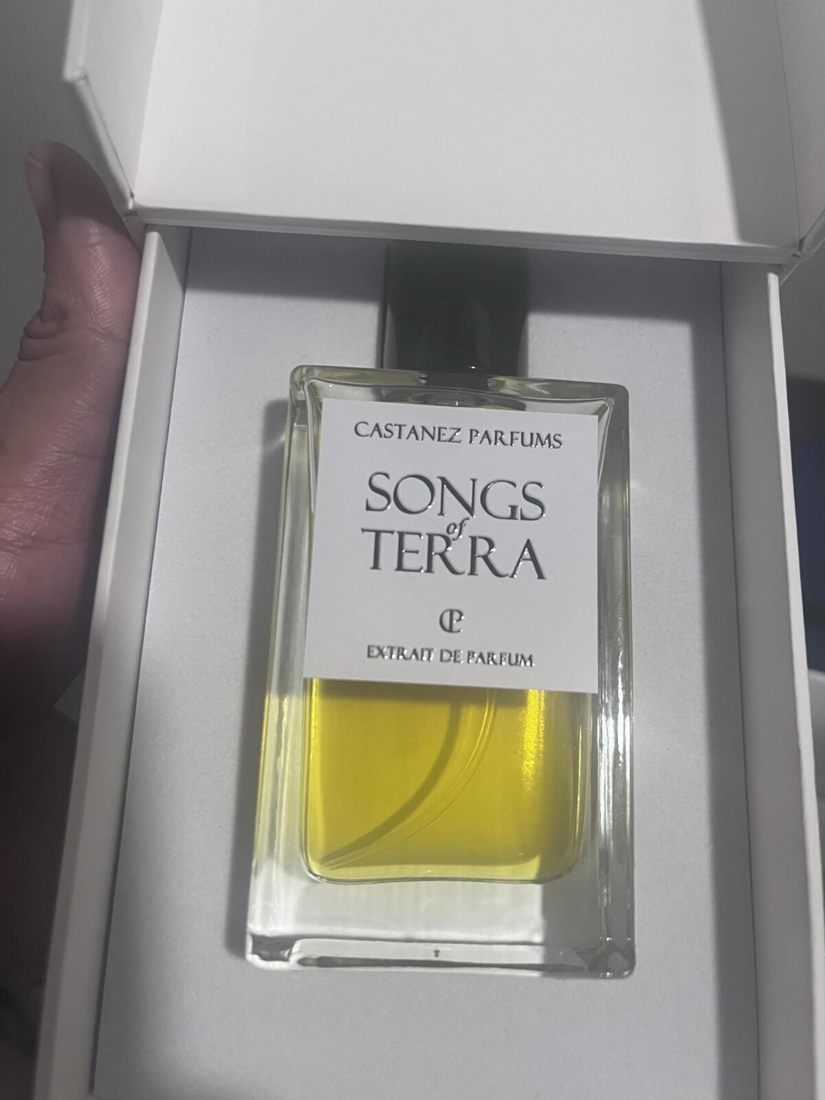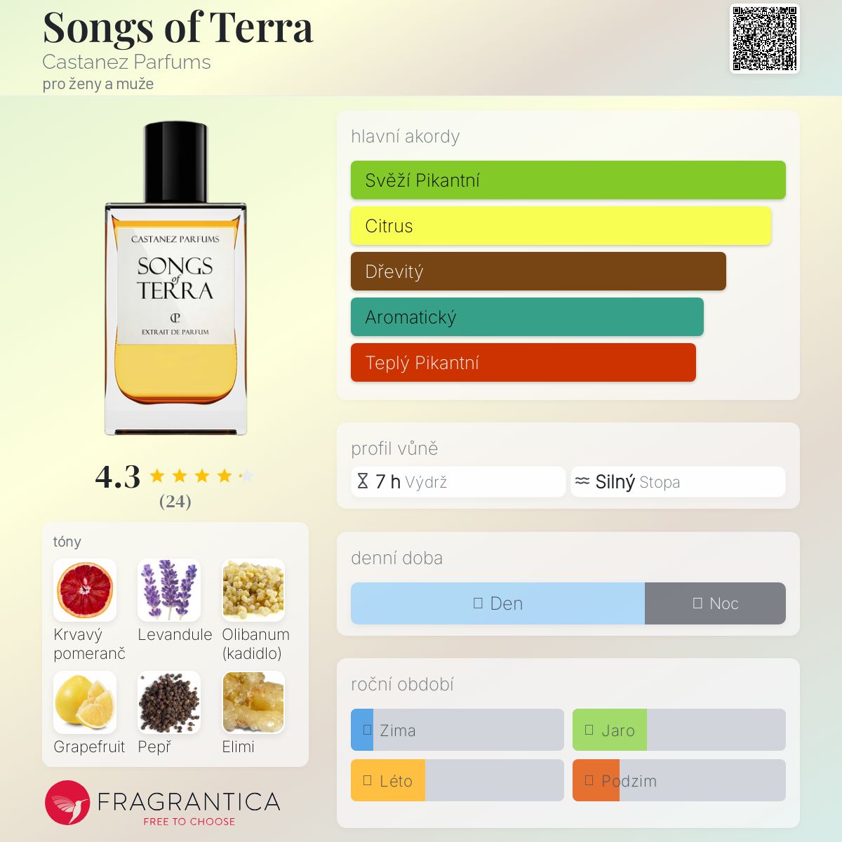 Songs of Terra podle Castanez Parfums je Aromatic Fougere vůně pro ženy a muže. Songs of Terra byl/a uveden/a v roce 2023. Songs of Terra byl/a vytvořen/a José Nuñez a Cecilia Castañeda. Vrchní tóny jsou Krvavý pomeranč, Grapefruit a Černý pepř; střední tóny jsouLevandule, Elimi a Zázvor ; základní tóny jsou Olibanum, Bílé pižmo, Cedr, Santalové dřevo, Cedrové listy, Růžový pepř, Tabák a Dubový mech.