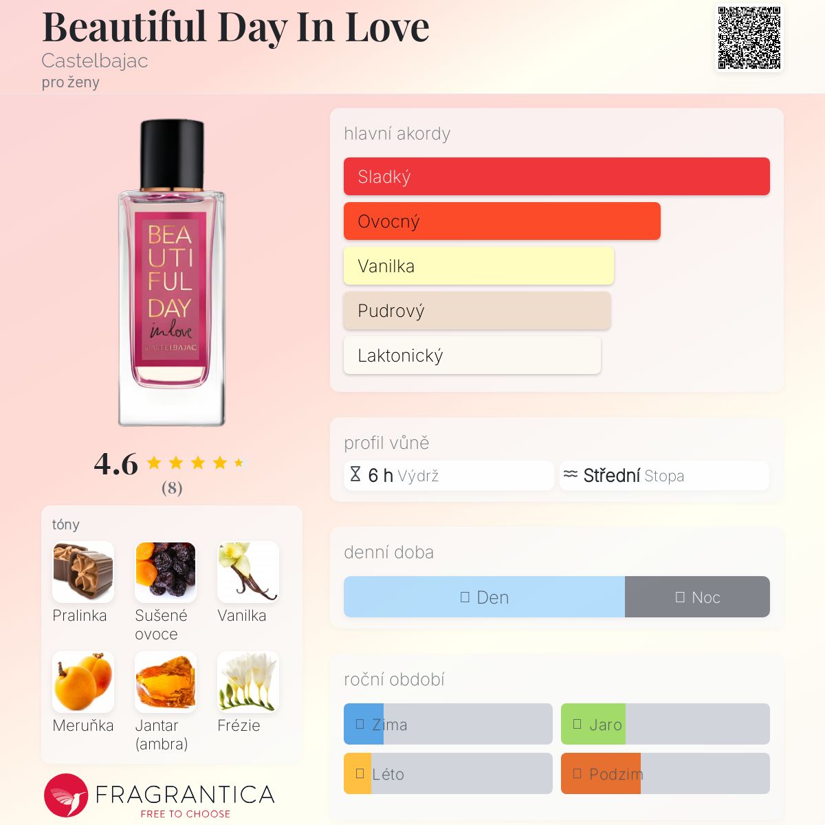 Beautiful Day In Love podle Castelbajac je Floral Fruity Gourmand vůně pro ženy. Beautiful Day In Love byl/a uveden/a v roce 2022. "Nosem" za touto vůní je Karine Dubreuil-Sereni. Vrchní tóny jsou Frézie a Konvalinka; střední tóny jsouSušené ovoce a Meruňka ; základní tóny jsou Pralinka, Madagaskarská vanilka, Bílý jantar (ambra), Virginský cedr a Pižmo.