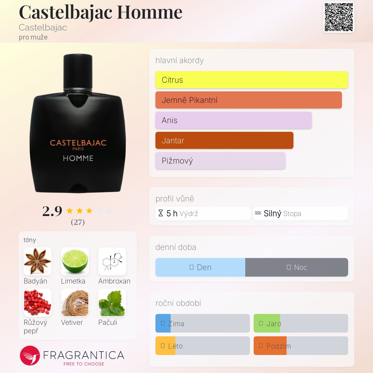 Castelbajac Homme podle Castelbajac je Woody Aromatic vůně pro muže. Castelbajac Homme byl/a uveden/a v roce 2019. "Nosem" za touto vůní je Benoist Lapouza. Vrchní tón je Limetka ; střední tóny jsouBadyán a Růžový pepř ; základní tóny jsou Ambroxan, Vetiver a Pačuli.