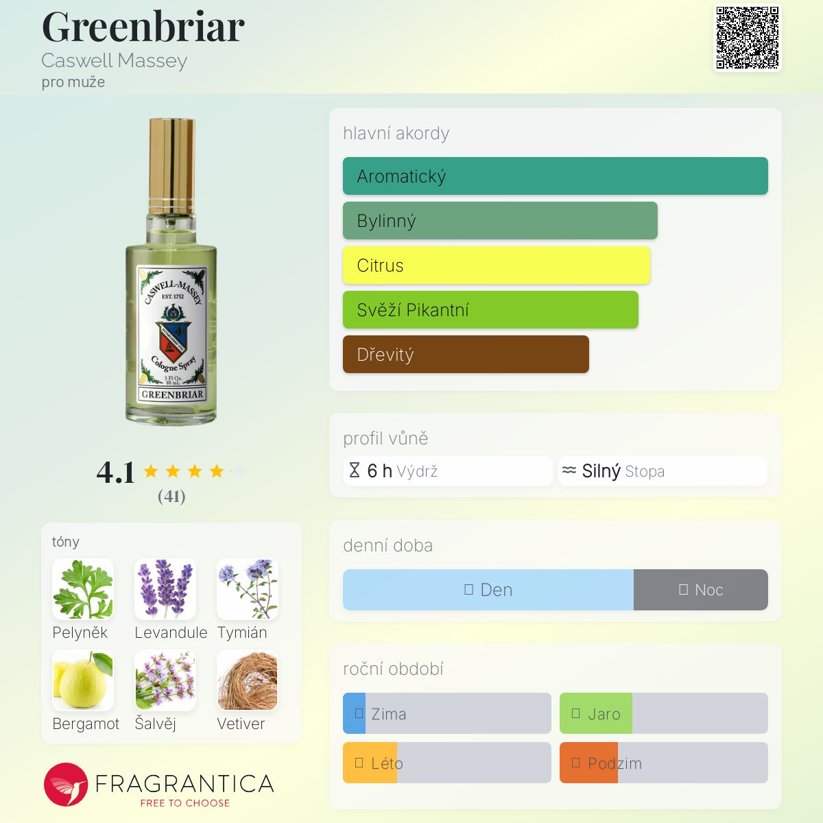 Greenbriar podle Caswell Massey je Woody Aromatic vůně pro muže. Vrchní tóny jsou Pelyněk, Bergamot, Grapefruit a Citrón; střední tóny jsouLevandule, Tymián a Šalvěj ; základní tóny jsou Vetiver, Santalové dřevo a Jantar (ambra).