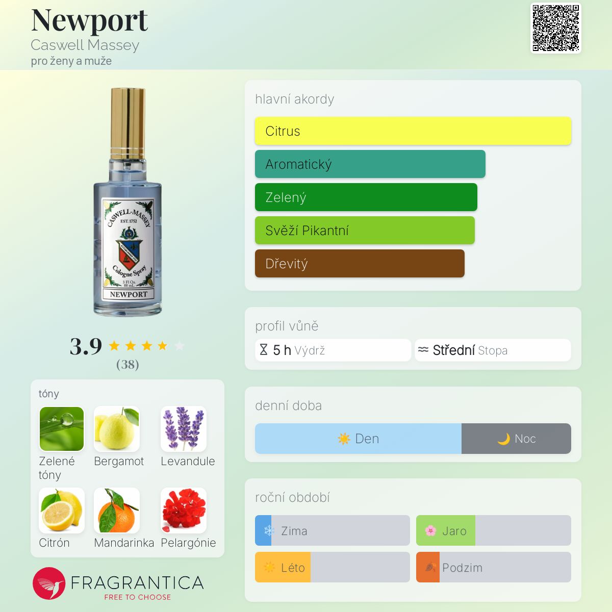 Newport podle Caswell Massey je Floral Green vůně pro ženy a muže. Vrchní tóny jsou Zelené tóny, Bergamot, Citron amalfi a Mandarinka; střední tóny jsouLevandule, Pelargónie, Růže a Konvalinka ; základní tóny jsou Santalové dřevo, Virginský cedr, Jantar (ambra) a Vanilka.