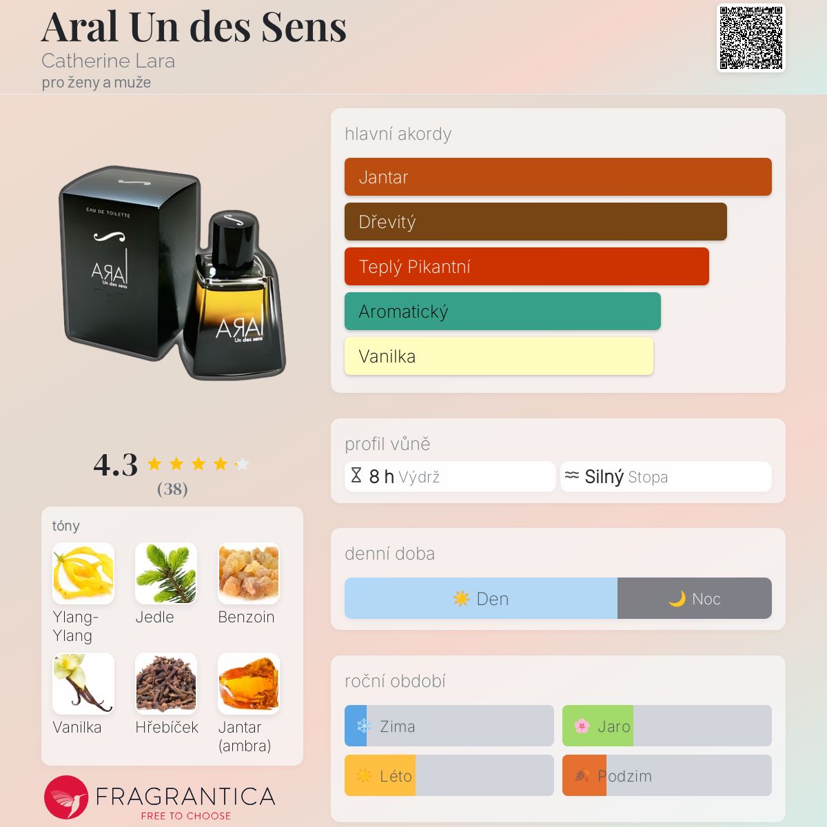 Aral Un des Sens podle Catherine Lara je Orientální vůně pro ženy a muže. Aral Un des Sens byl/a uveden/a v roce 2009. "Nosem" za touto vůní je Technicoflor. Vrchní tóny jsou Hřebíček, Petitgrain, Kardamom, Citron amalfi , Bergamot a Grapefruit; střední tóny jsouYlang-Ylang, Jedle, Jantar (ambra), Virginský cedr, Kadidlo a Pačuli ; základní tóny jsou Benzoin, Vanilka, Fazole tonka, Styrax a Pižmo.