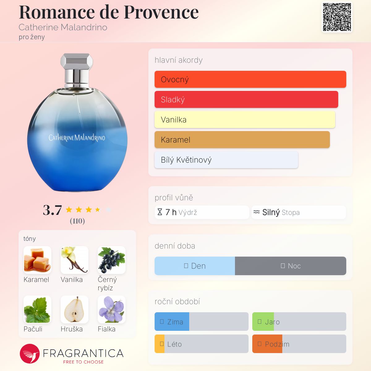 Romance de Provence podle Catherine Malandrino je Floral Fruity Gourmand vůně pro ženy. Romance de Provence byl/a uveden/a v roce 2016. Vrchní tóny jsou Černý rybíz, Hruška, Mandarinka a Květ jabloně; střední tóny jsouFialka, Zelený čaj, Jasmín, Růže, Pomerančový květ a Lilie ; základní tóny jsou Karamel, Vanilka, Pačuli, Fazole tonka a Jantar (ambra).
