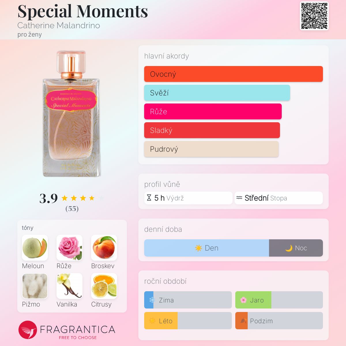 Special Moments podle Catherine Malandrino je vůně pro ženy. Special Moments byl/a uveden/a v roce 2022. Vrchní tóny jsou Meloun, Broskev, Citrusy a Švestka; střední tóny jsouRůžová voda, Jasmín a Brambořík ; základní tóny jsou Bílé pižmo, Vanilkový lusk a Jantar (ambra).