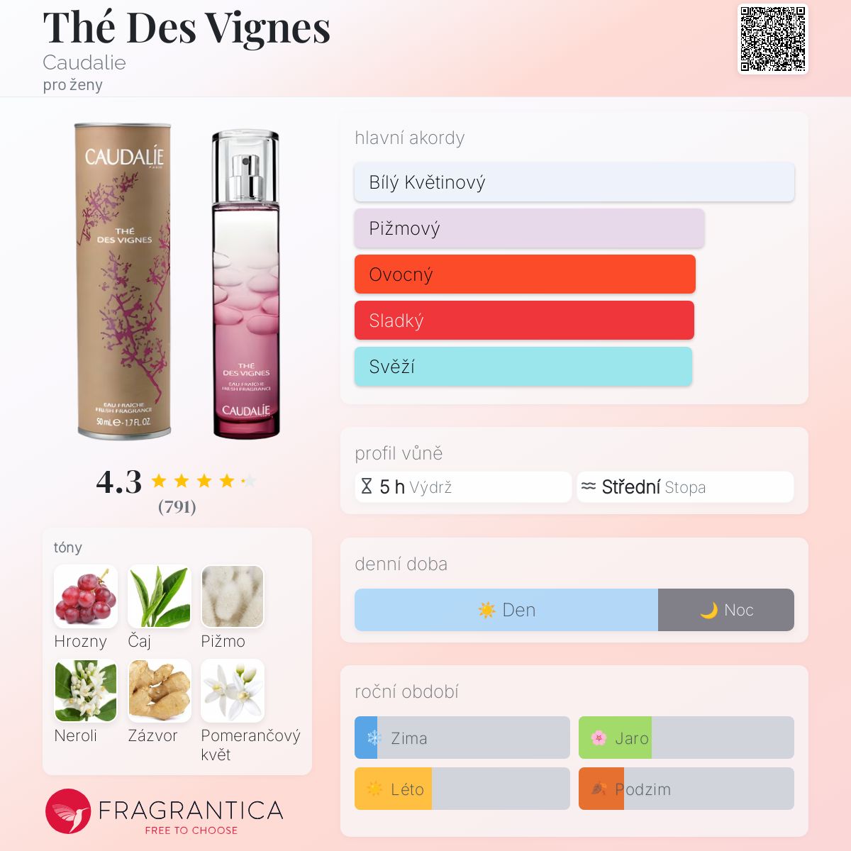 Thé Des Vignes podle Caudalie je Floral vůně pro ženy. Thé Des Vignes byl/a uveden/a v roce 2011. "Nosem" za touto vůní je Jacques Cavallier Belletrud. Vrchní tóny jsou Čaj, Květ afrického pomeranče a Jasmín; střední tóny jsouHrozny, Neroli a Zázvor ; základní tóny jsou Pižmo, Dřevité tóny a Med.