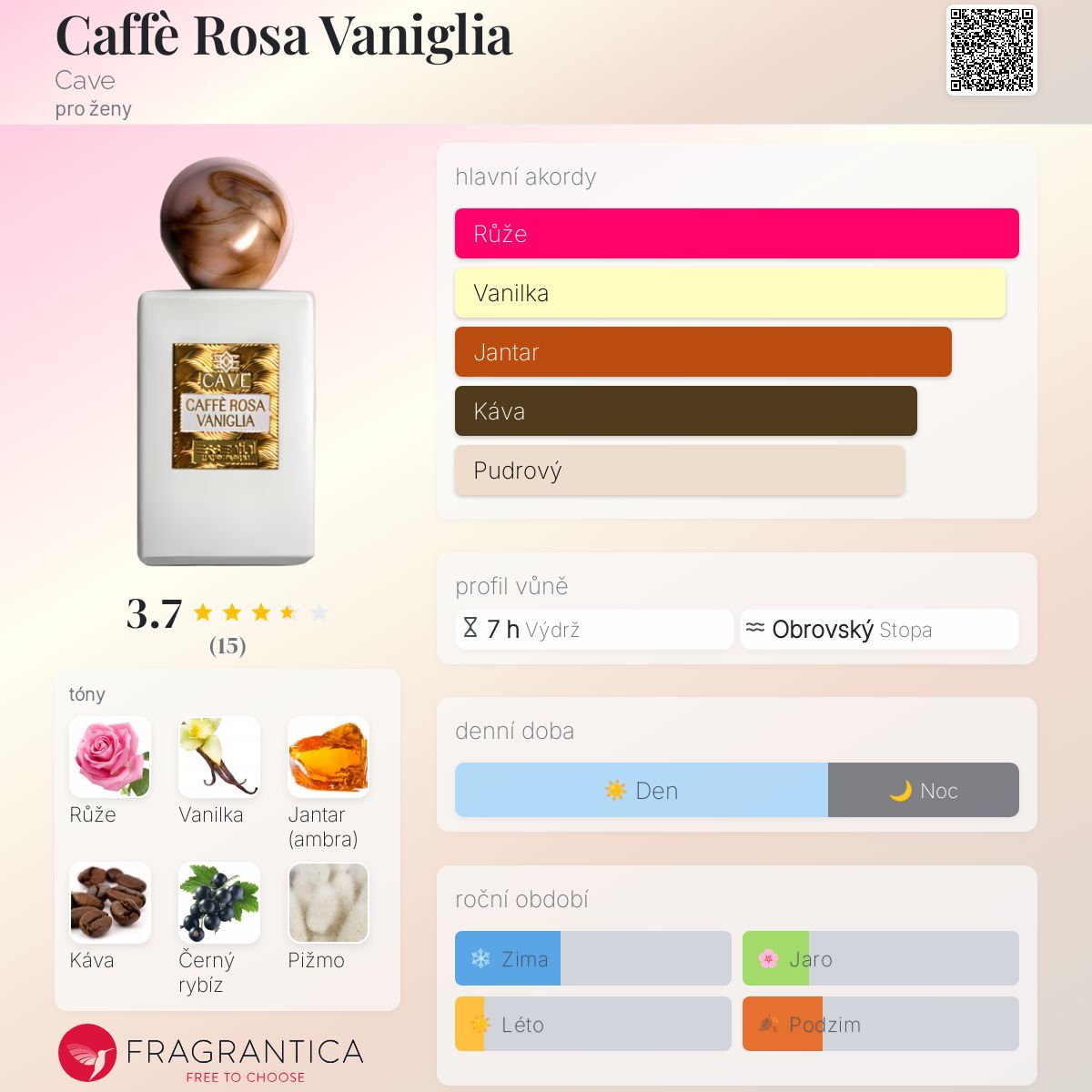 Caffè Rosa Vaniglia podle Cave je vůně pro ženy. Vrchní tóny jsou Káva a Černý rybíz; střední tóny jsouTurecká růže, Vanilka, Káva, Cukr a Nutella ; základní tóny jsou Jantar (ambra), Bílé pižmo a Dřevité tóny.