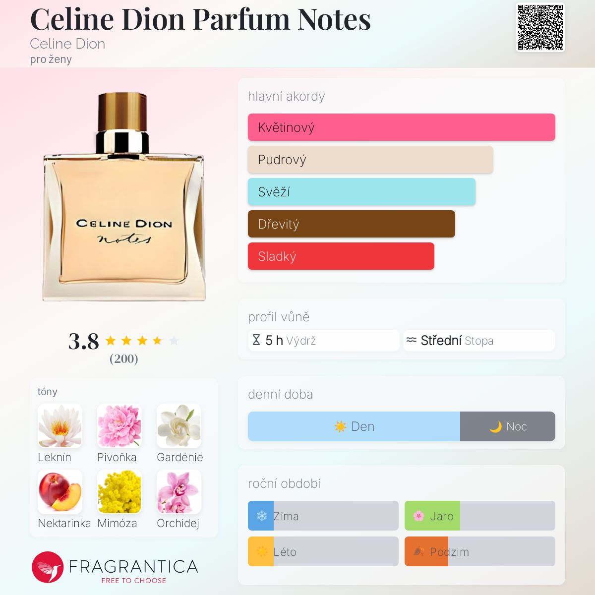 Celine Dion Parfum Notes podle Celine Dion je Floral vůně pro ženy. Celine Dion Parfum Notes byl/a vytvořen/a Jean-Pierre Bethouart a Jean Claude Delville. Vrchní tóny jsou Leknín, Gardénie, Nektarinka a Mimóza; střední tóny jsouPivoňka, Orchidej a Otočník ; základní tóny jsou Vetiver, Australské santalové dřevo, Bílé pižmo a Guajakové dřevo.