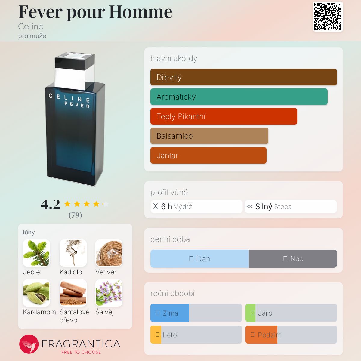Fever pour Homme podle Celine je Woody Spicy vůně pro muže. Fever pour Homme byl/a uveden/a v roce 2005. "Nosem" za touto vůní je Ilias Ermenidis. Vrchní tóny jsou Jedlová pryskyřice a Kardamom; střední tóny jsouKadidlo, Šalvěj a Růže ; základní tóny jsou Vetiver, Santalové dřevo, Pižmo a Pačuli.