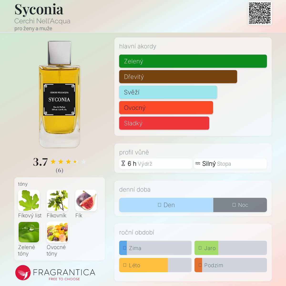 Syconia podle Cerchi Nell’Acqua je Aromatic Fruity vůně pro ženy a muže. Syconia byl/a uveden/a v roce 2017. "Nosem" za touto vůní je Enrico Buccella. Vrchní tóny jsou Fíkový list, Fíkovník a Fík; střední tóny jsouFíkovník, Zelené tóny a Ovocné tóny ; základní tóny jsou Fíkový list, Fíkovník, Fík a Ovocné tóny.