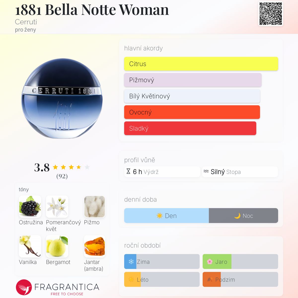 1881 Bella Notte Woman podle Cerruti je Floral Woody Musk vůně pro ženy. 1881 Bella Notte Woman byl/a uveden/a v roce 2014. "Nosem" za touto vůní je Aurélien Guichard. Vrchní tóny jsou Ostružina a Bergamot; střední tón jePomerančový květ ; základní tóny jsou Pižmo, Vanilka a Jantar (ambra).