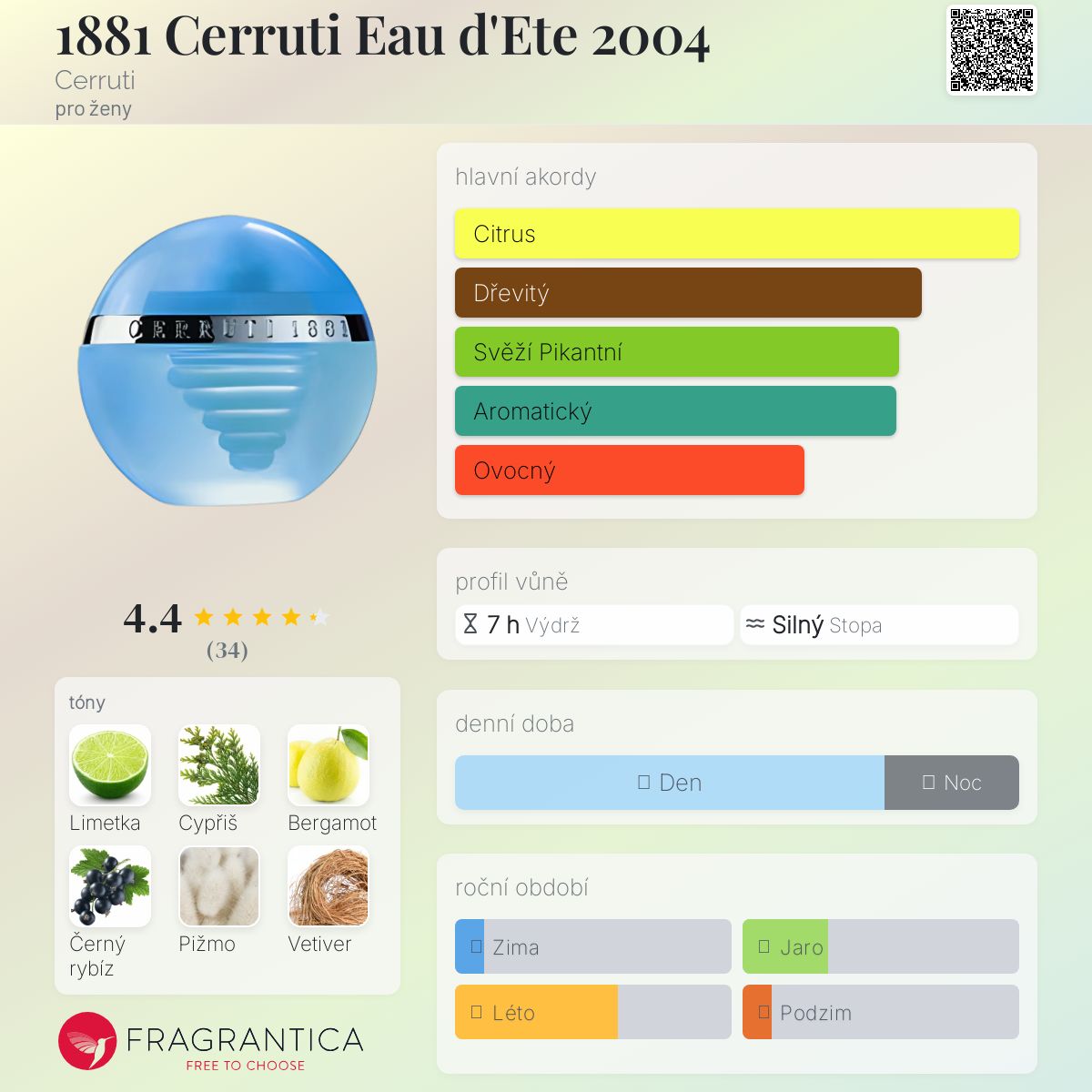 1881 Cerruti Eau d'Ete 2004 podle Cerruti je Floral Woody Musk vůně pro ženy. 1881 Cerruti Eau d'Ete 2004 byl/a uveden/a v roce 2004. Vrchní tóny jsou Limetka, Bergamot a Mandarinka; střední tóny jsouCypřiš, Černý rybíz, Muškátový oříšek, Pomeranč, Růže, Olivový květ a Jasmín ; základní tóny jsou Pižmo, Vetiver, Vanilka, Jantar (ambra) a Santalové dřevo.