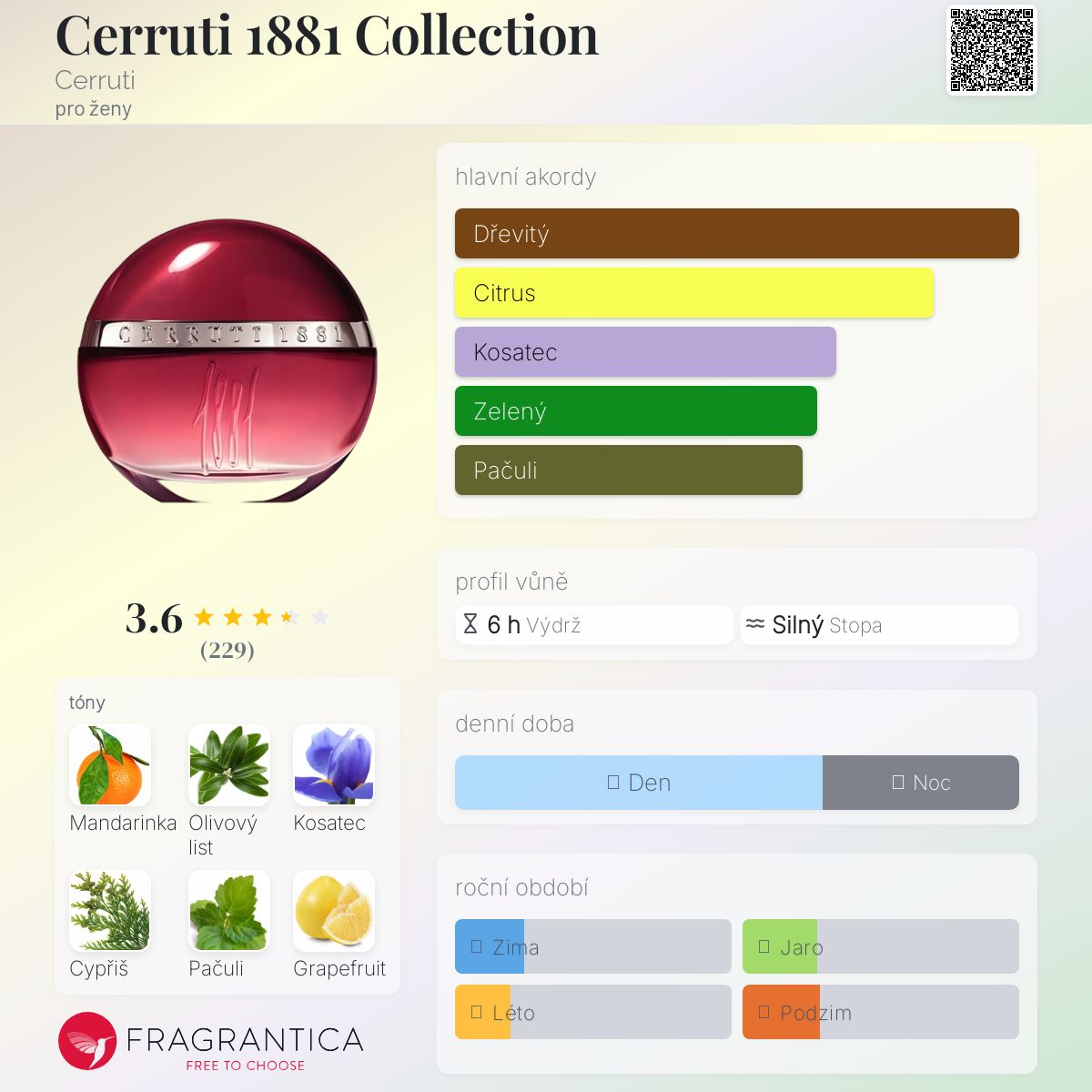 Cerruti 1881 Collection podle Cerruti je Orientální Floral vůně pro ženy. Cerruti 1881 Collection byl/a uveden/a v roce 2005. Cerruti 1881 Collection byl/a vytvořen/a Rodrigo Flores-Roux a Yann Vasnier. Vrchní tóny jsou Sicilská mandarinka a Olivový list; střední tóny jsouKosatec a Grapefruit ; základní tóny jsou Toskánský cypřiš a Pačuli.