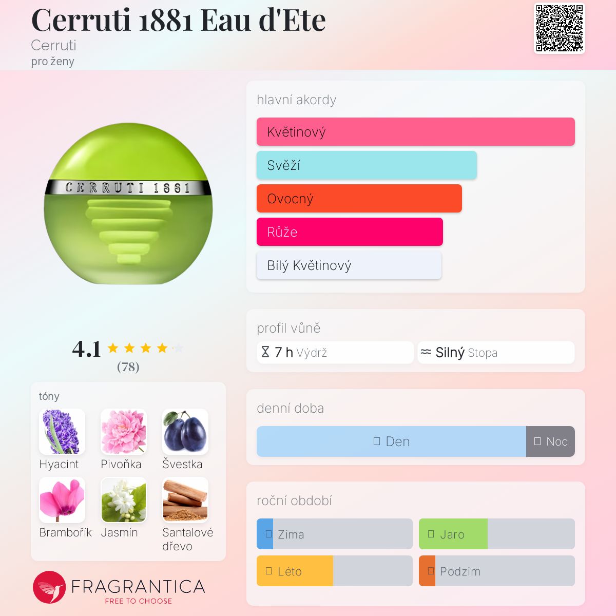 Cerruti 1881 Eau d'Ete podle Cerruti je Floral Green vůně pro ženy. Cerruti 1881 Eau d'Ete byl/a uveden/a v roce 2003. "Nosem" za touto vůní je Beatrice Piquet. Vrchní tóny jsou Růžový hyacint a Brambořík; střední tóny jsouČervená pivoňka, Švestka a Jasmín ; základní tóny jsou Santalové dřevo a Bílý jantar (ambra).