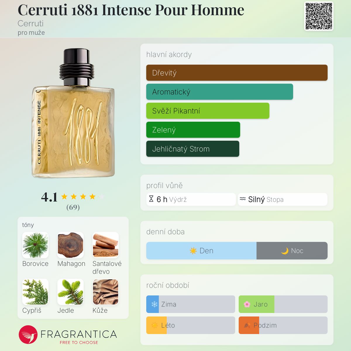 Cerruti 1881 Intense Pour Homme podle Cerruti je Woody Aromatic vůně pro muže. Cerruti 1881 Intense Pour Homme byl/a uveden/a v roce 2008. "Nosem" za touto vůní je Norbert Bijaoui. Vrchní tóny jsou Cypřiš, Jedlová pryskyřice, Bazalka, Bergamot, Jalovcové bobulky a Růžový pepř; střední tóny jsouBorovice, Pačuli, Levandule a Ylang-Ylang ; základní tóny jsou Mahagon, Santalové dřevo, Kůže, Dubový mech a Pižmo.