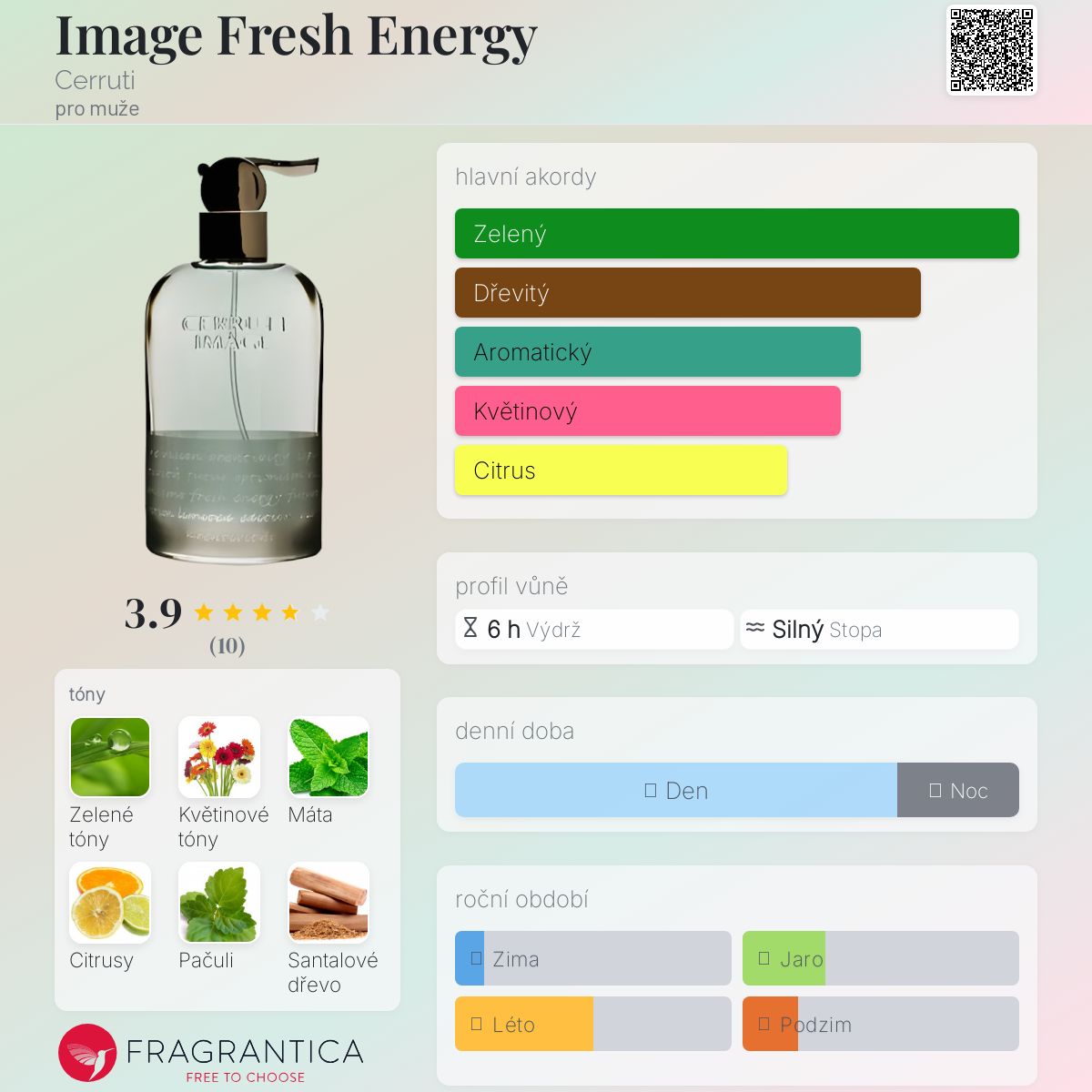 Image Fresh Energy podle Cerruti je Aromatic Green vůně pro muže. Image Fresh Energy byl/a uveden/a v roce 2008. Vrchní tóny jsou Máta a Citrusy; střední tóny jsouZelené tóny a Květinové tóny ; základní tóny jsou Pačuli, Santalové dřevo, Vetiver, Cedr a Pižmo.