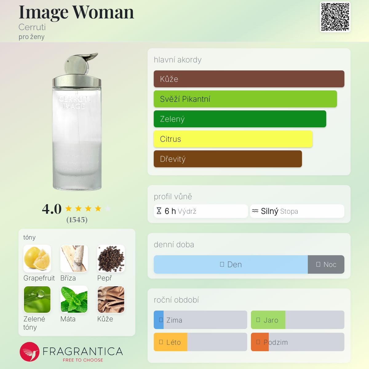 Image Woman podle Cerruti je Citrus Aromatic vůně pro ženy. Image Woman byl/a uveden/a v roce 2000. "Nosem" za touto vůní je Harry Fremont. Vrchní tóny jsou Grapefruit, Pepř a Zelené tóny; střední tón jeMáta ; základní tóny jsou Bříza, Kůže, Virginský cedr a Jantar (ambra).