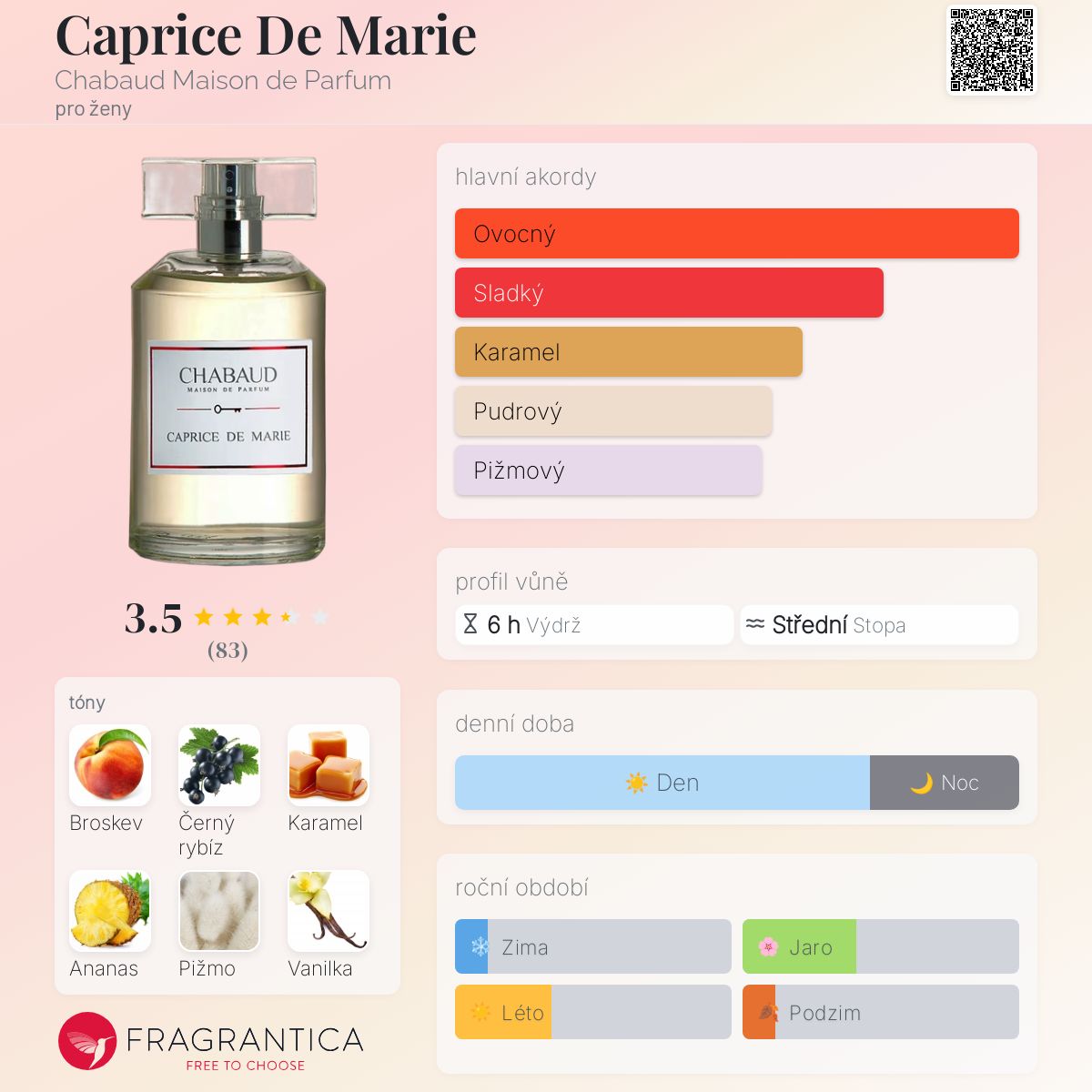 Caprice De Marie podle Chabaud Maison de Parfum je vůně pro ženy. Caprice De Marie byl/a uveden/a v roce 2021. Vrchní tóny jsou Černý rybíz, Ananas a Hruška; střední tóny jsouBroskev a Karamel ; základní tóny jsou Pižmo, Přírodní vanilka a Pačuli.