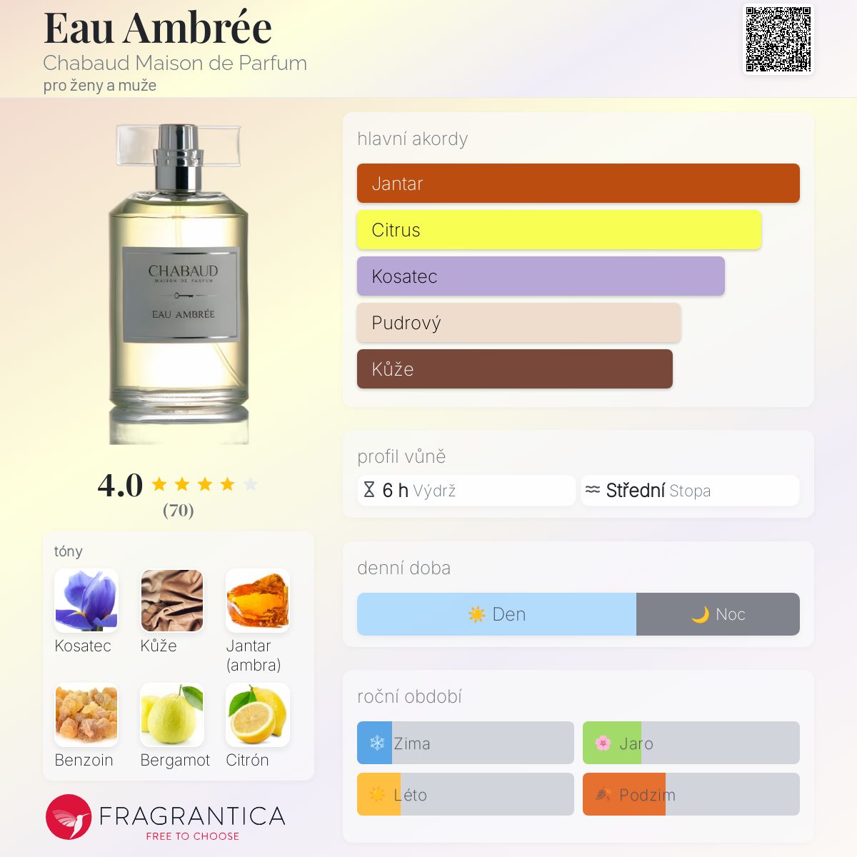 Eau Ambrée podle Chabaud Maison de Parfum je Orientální Floral vůně pro ženy a muže. Vrchní tóny jsou Bergamot, Citrón a Neroli; střední tóny jsouKosatec a Růže ; základní tóny jsou Kůže, Jantar (ambra) a Benzoin.