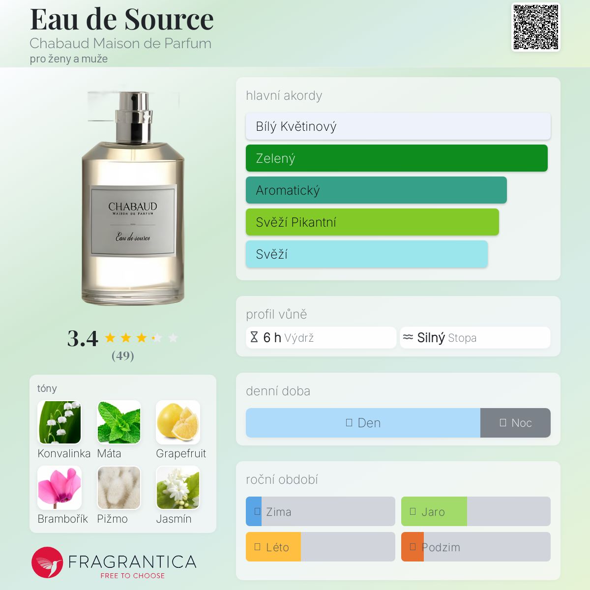 Eau de Source podle Chabaud Maison de Parfum je Floral Green vůně pro ženy a muže. Eau de Source byl/a uveden/a v roce 2015. "Nosem" za touto vůní je Sophie Chabaud. Vrchní tóny jsou Máta, Grapefruit a Pelargónie; střední tóny jsouKonvalinka, Brambořík, Jasmín a Růže ; základní tóny jsou Bílé pižmo a Cedr.