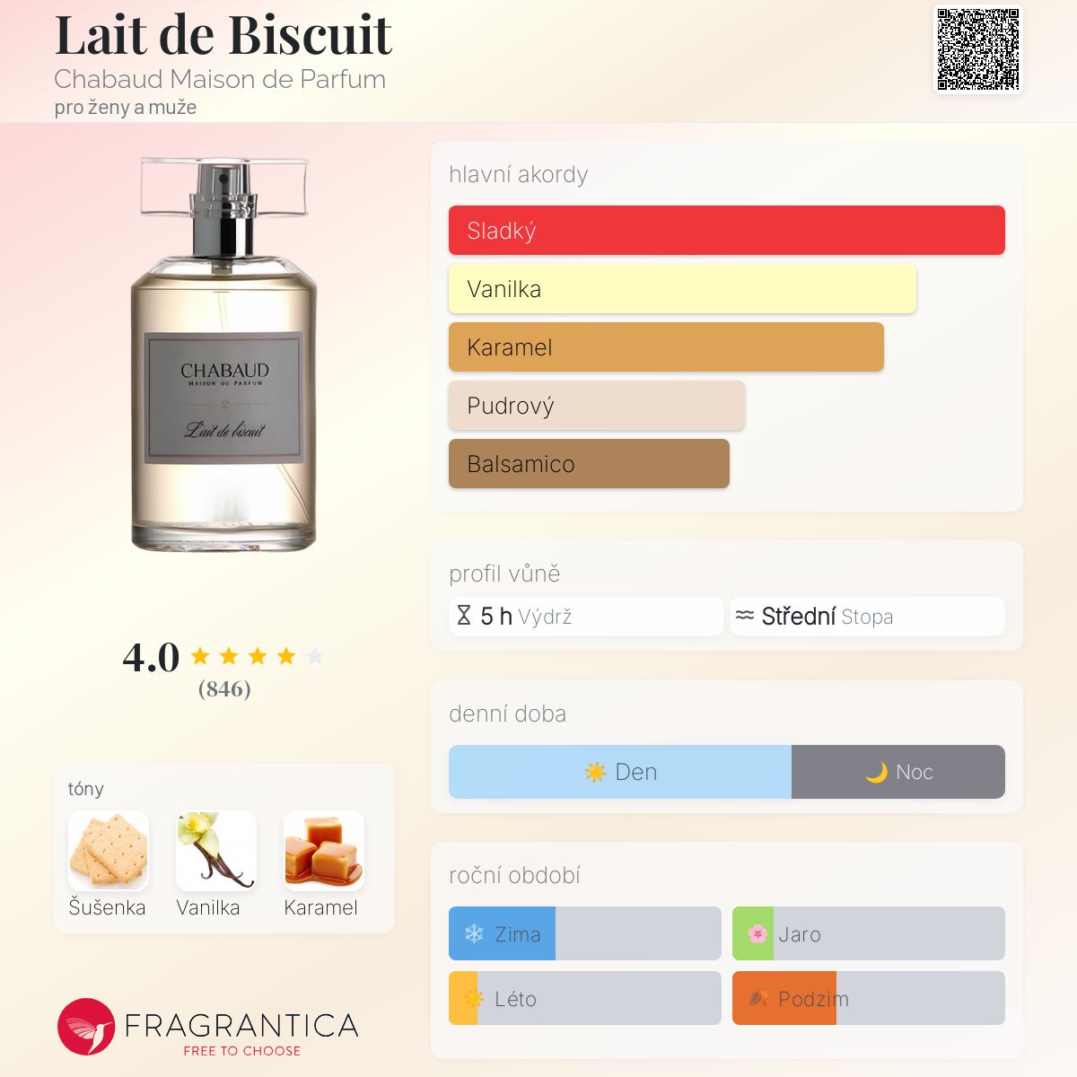 Parfémovým objevem dne je Lait de Biscuit od niche značky Chabaud, která je známá tím, že každá jednotlivá vůně je stoprocentně nositelná a nejtvrdší tón, i když je deklarován jako hlavní, zní zaobleně a lidsky. Žádná misantropie ani spálené hadry. Tento konkrétní exemplář voní po kondenzovaném mléce, které i přes svou upřímnou dezertovost zní velmi intimně a ne špatně.
