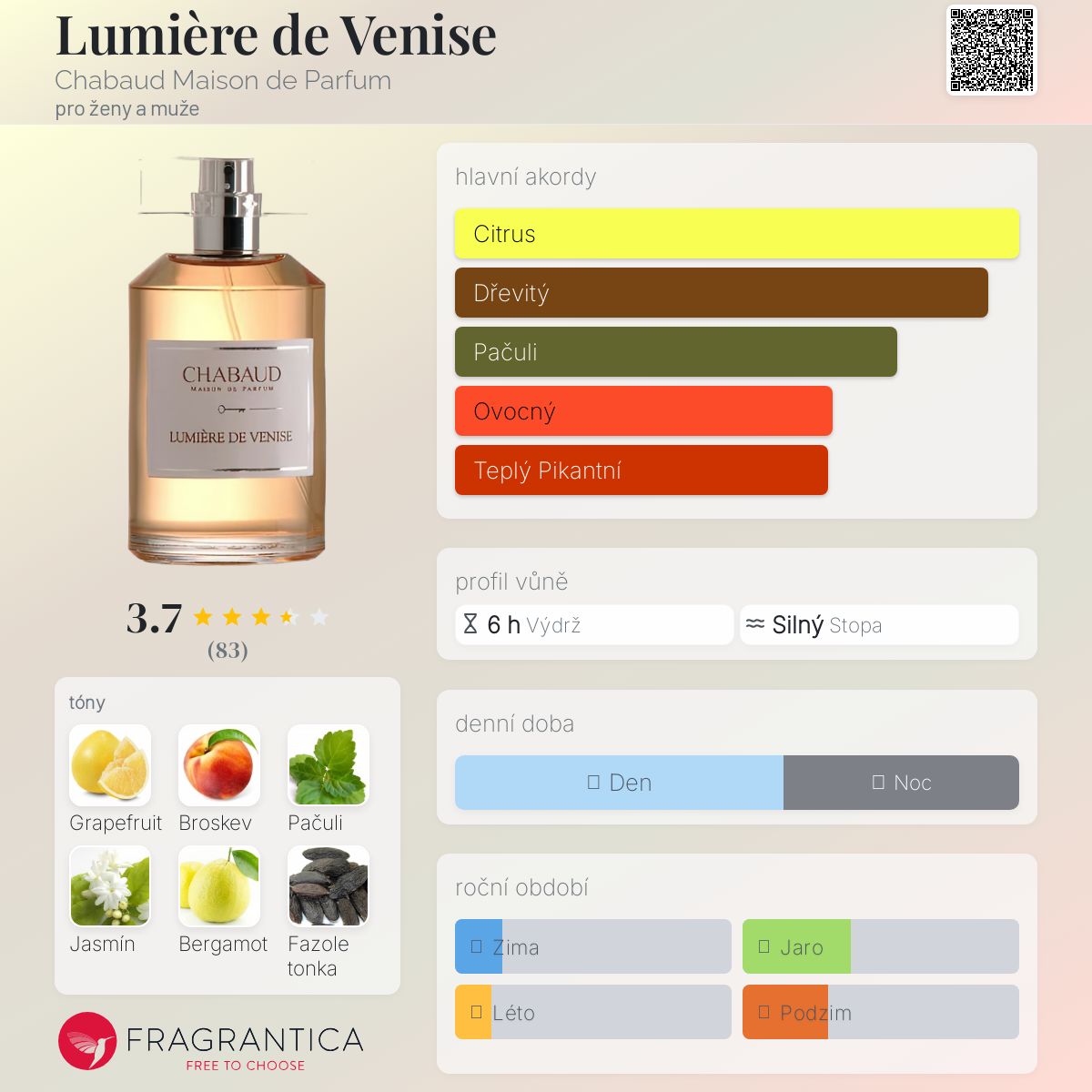 Lumière de Venise podle Chabaud Maison de Parfum je vůně pro ženy a muže. Lumière de Venise byl/a uveden/a v roce 2015. "Nosem" za touto vůní je Sophie Chabaud. Vrchní tóny jsou Grapefruit a Bergamot; střední tóny jsouBroskev, Jasmín, Růže a Fialka ; základní tóny jsou Pačuli, Fazole tonka, Dřevité tóny, Dubový mech a Santalové dřevo.