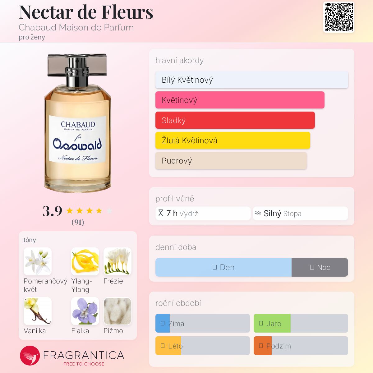 Nectar de Fleurs podle Chabaud Maison de Parfum je Floral vůně pro ženy. Nectar de Fleurs byl/a uveden/a v roce 2015. "Nosem" za touto vůní je Sophie Chabaud. Vrchní tóny jsou Frézie a Neroli; střední tóny jsouPomerančový květ, Ylang-Ylang, Fialka a Růže ; základní tóny jsou Bourbonská vanilka a Bílé pižmo.