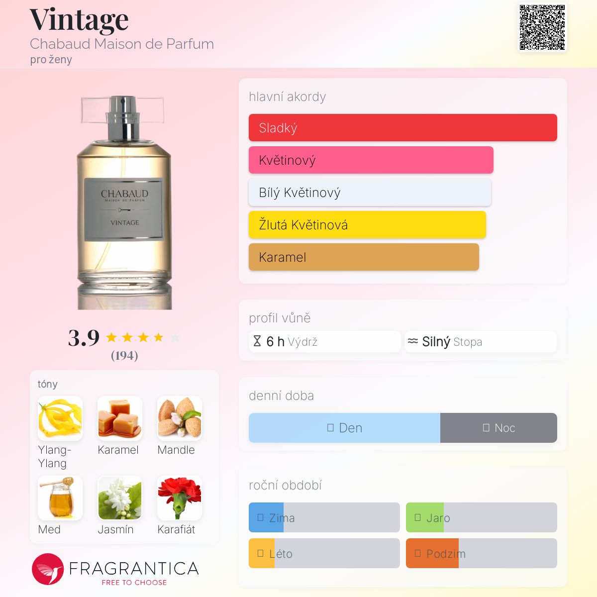 Vintage podle Chabaud Maison de Parfum je Orientální Floral vůně pro ženy. Vrchní tóny jsou Karafiát a Mandarinka; střední tóny jsouYlang-Ylang, Jasmín a Tuberóza ; základní tóny jsou Karamel, Mandle a Med.