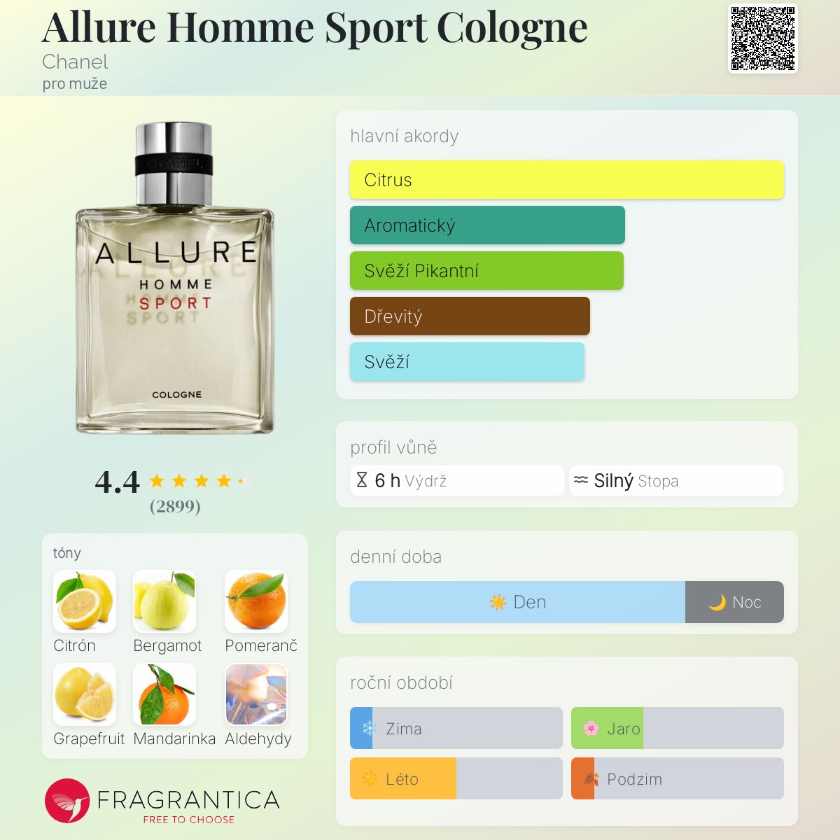Kolínská voda Allure Homme Sport je velmi dobrá citrusová vůně. Cítíte, že tóny jsou kvalitní a lehce přírodní, v podstatě je to velmi pižmová citrusová vůně s nádechem tonky. Jako vůně typu Sport je mnohem lepší než její sestra Allure Sport, protože tato dává pocit, že je určena pro sportovnější nebo uvolněnější aktivity, i když vzhledem k její ceně bych ji použil spíše na akce, které vyžadují ležérní oblečení.