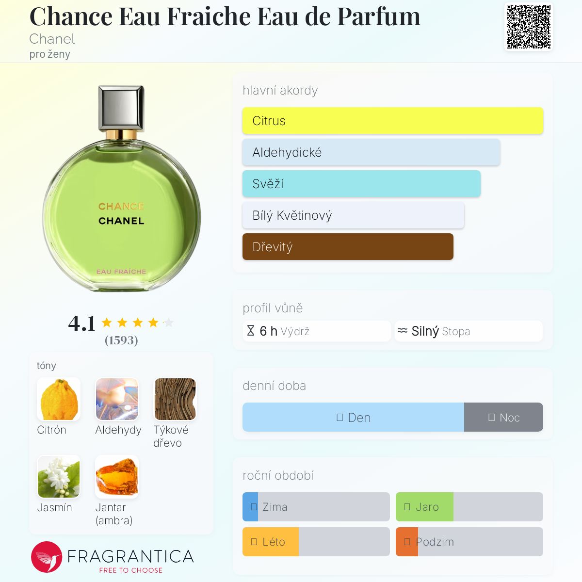 Chance Eau Fraiche Eau de Parfum podle Chanel je vůně pro ženy. Chance Eau Fraiche Eau de Parfum byl/a uveden/a v roce 2023. "Nosem" za touto vůní je Olivier Polge. Vrchní tóny jsou Citrón a Aldehydy; střední tón jeJasmín ; základní tóny jsou Týkové dřevo a Jantar (ambra).