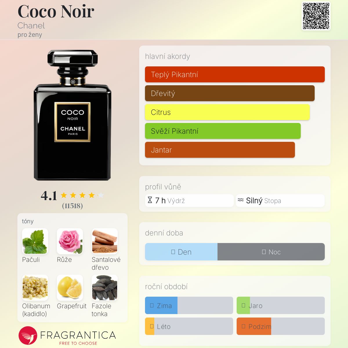 Coco Noir vypadá jako nová interpretace ikonické Coco Mademoiselle. Dřevitě pižmová květinová vůně s vážnějším a výraznějším nádechem. Vrchní nóta je silná a plná pačuli, růže a pižmových tónů. Právě v tomto bodě se začíná lišit od Mademoiselle, protože citrusové tóny nepřevažují, ale vynikají květinové tóny, jasmín a narcis dodávají kompozici větší uzavřenost. Sladkost vanilky a oříšková vůně bobu ji činí více noční. Dřevité pozadí má na svědomí olibanum, které je lehce rozbito hřejivou vůní santalového dřeva. Vůně dobře plní svůj účel: je silná, noční a zahalující. Je ideální pro fanoušky značky Chanel, zejména pro ty, kteří si již oblíbili Coco Mademoiselle a Allure Sensuelle. Ztotožní se s ní i ti, kterým se líbí Midnight Poison.