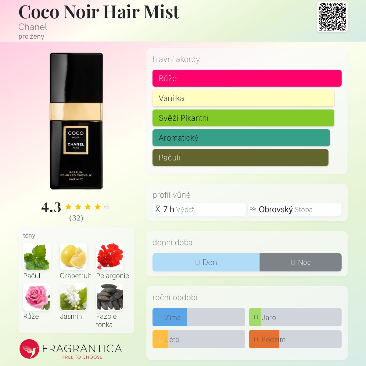 Coco Noir Hair Mist podle Chanel je Chypre Floral vůně pro ženy. Coco Noir Hair Mist byl/a uveden/a v roce 2018. Vrchní tón je Grapefruit ; střední tóny jsouPelargónie, Květná růže a Egyptský jasmín ; základní tóny jsou Pačuli, Fazole tonka, Bourbonská vanilka a Bílé pižmo.
