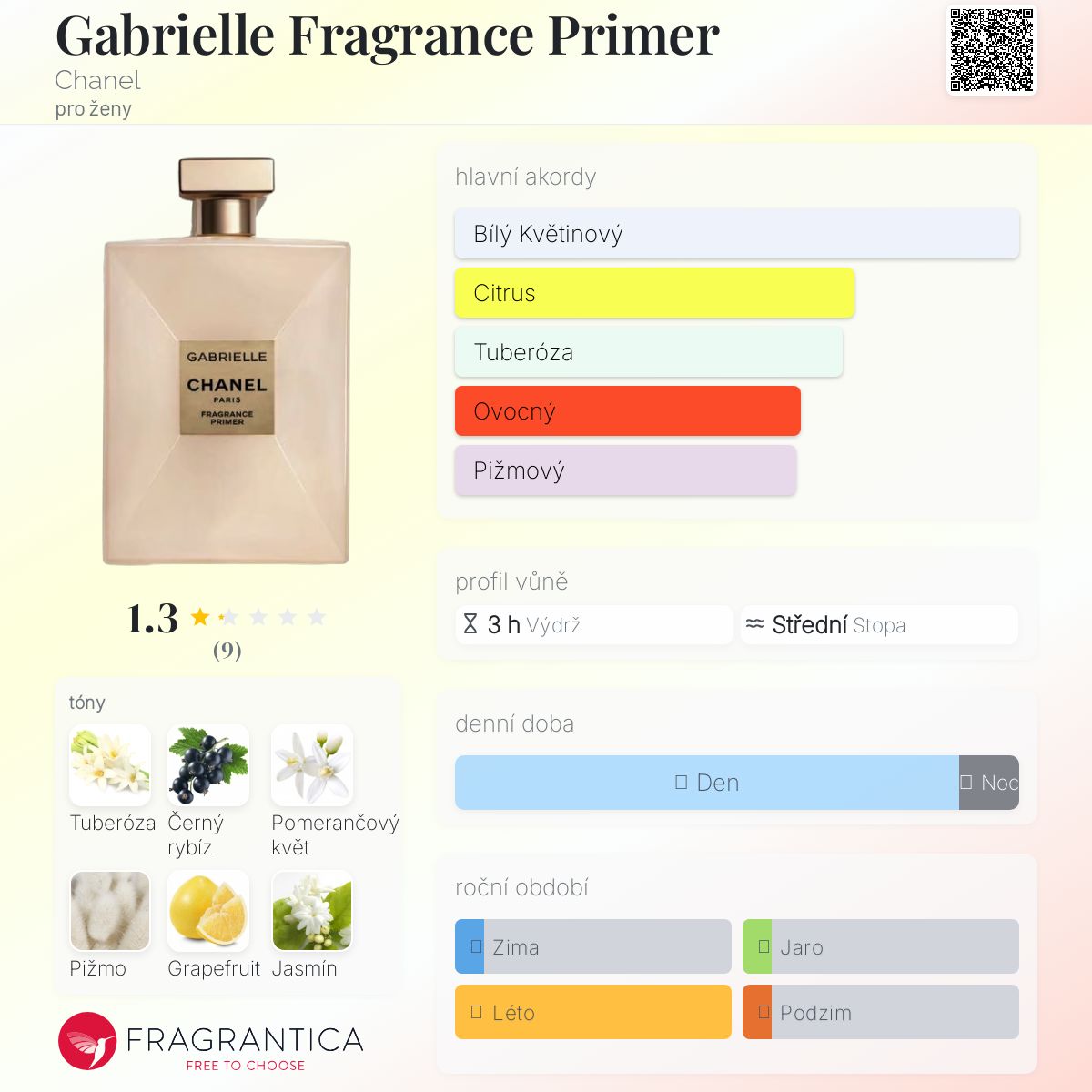 Gabrielle Fragrance Primer podle Chanel je Floral vůně pro ženy. Toto je nová vůně. Gabrielle Fragrance Primer byl/a uveden/a v roce 2025. Vrchní tóny jsou Černý rybíz, Grapefruit a Mandarinka; střední tóny jsouTuberóza, Pomerančový květ, Jasmín a Ylang-Ylang ; základní tóny jsou Pižmo a Santalové dřevo.