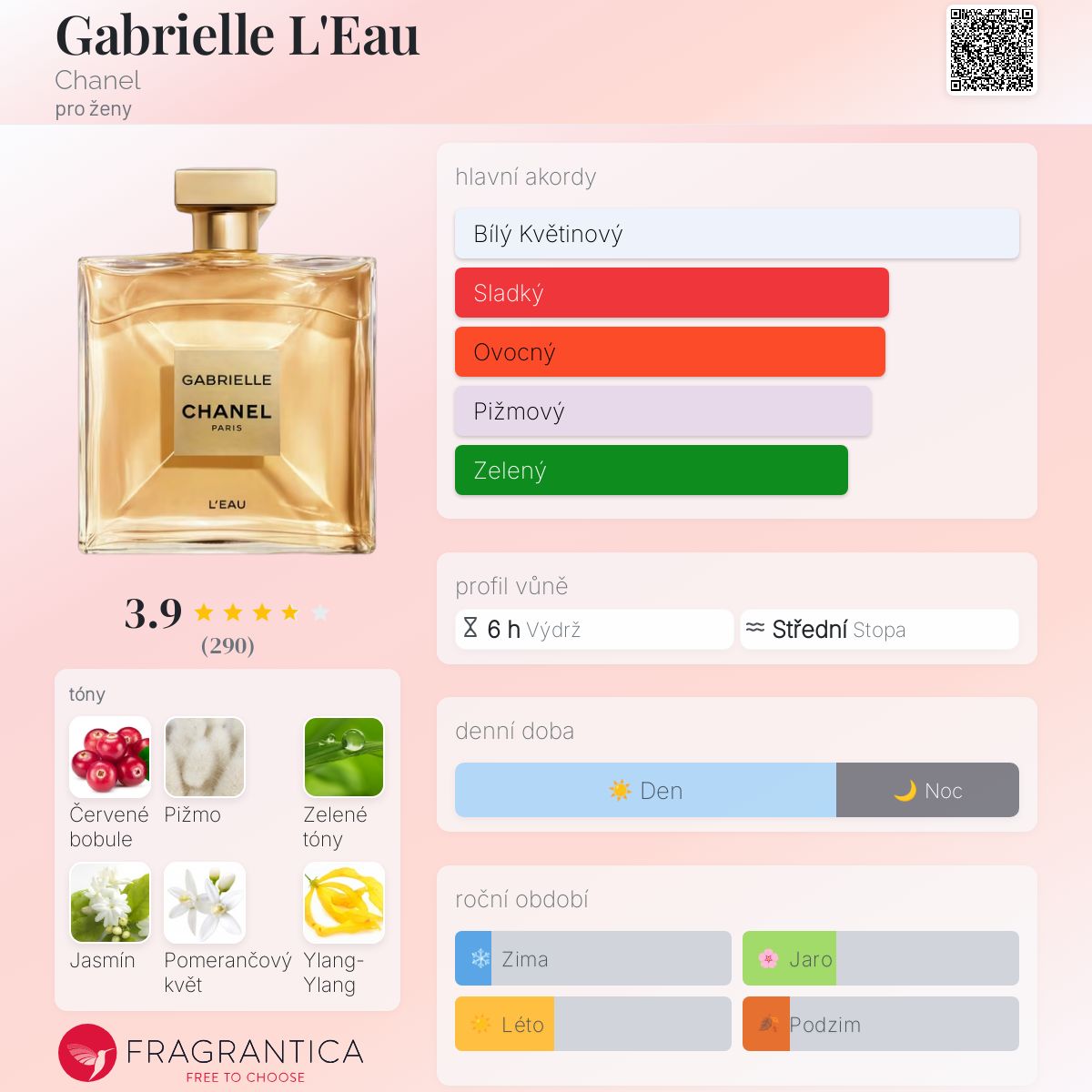 Gabrielle L'Eau podle Chanel je Floral Fruity vůně pro ženy. Toto je nová vůně. Gabrielle L'Eau byl/a uveden/a v roce 2024. "Nosem" za touto vůní je Olivier Polge. Vrchní tóny jsou Červené bobule a Zelené tóny; střední tóny jsouJasmín, Pomerančový květ, Ylang-Ylang a Tuberóza ; základní tóny jsou Pižmo a Santalové dřevo.