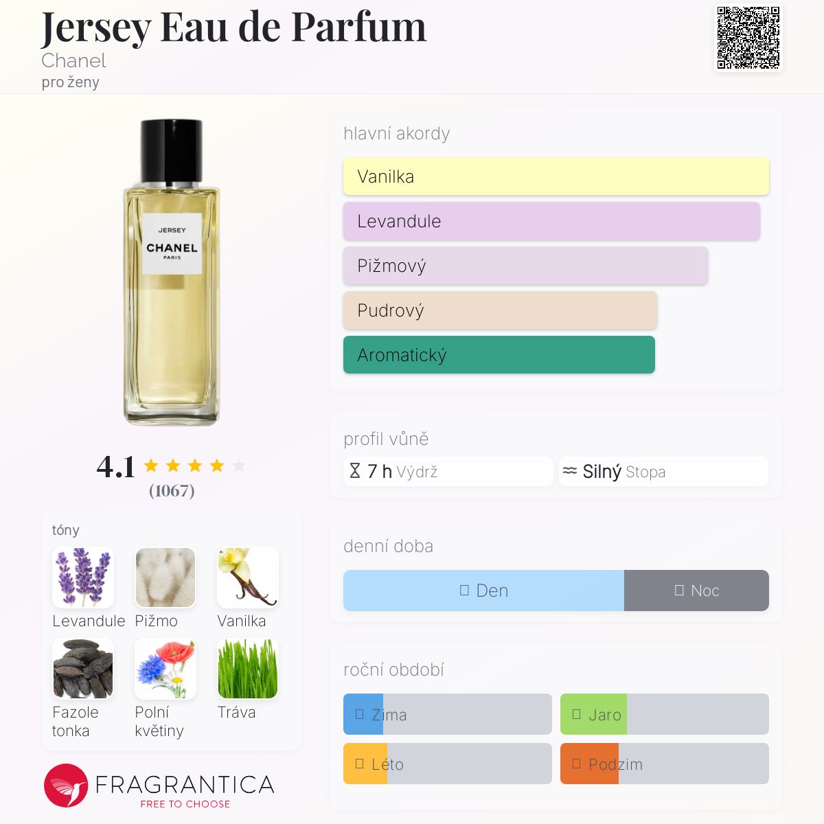 Jersey Eau de Parfum podle Chanel je Floral Woody Musk vůně pro ženy. Jersey Eau de Parfum byl/a uveden/a v roce 2016. "Nosem" za touto vůní je Jacques Polge.