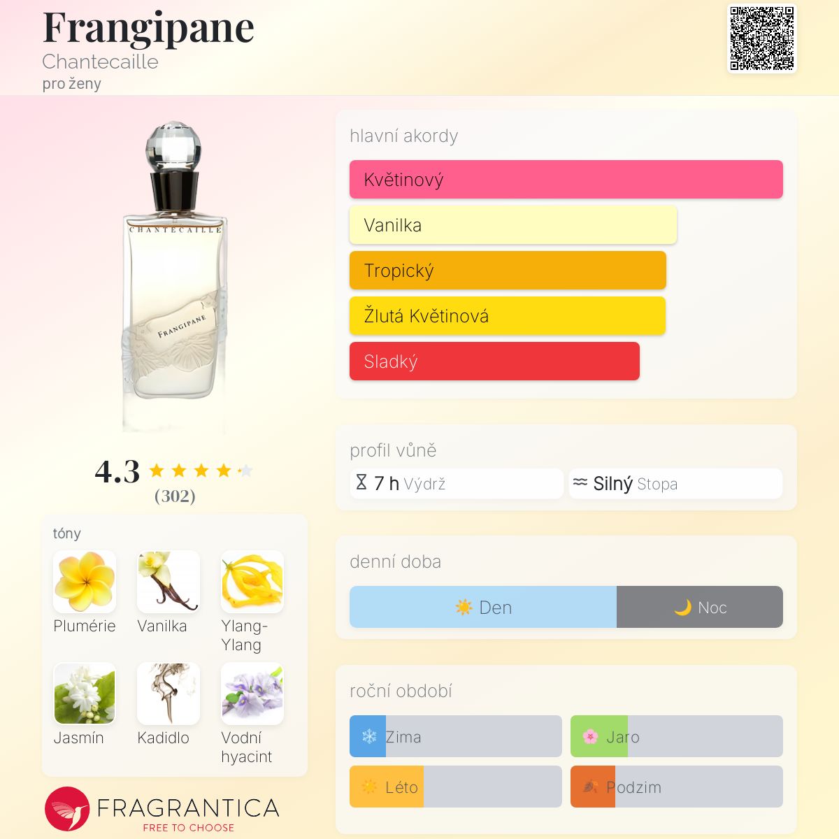 Frangipane podle Chantecaille je Orientální Floral vůně pro ženy. Frangipane byl/a uveden/a v roce 1997. Vrchní tóny jsou Vodní hyacint, Fialkový list a Pomeranč; střední tóny jsouPlumérie, Ylang-Ylang, Jasmín a Kadidlo ; základní tóny jsou Vanilka, Jantar (ambra) a Pižmo.