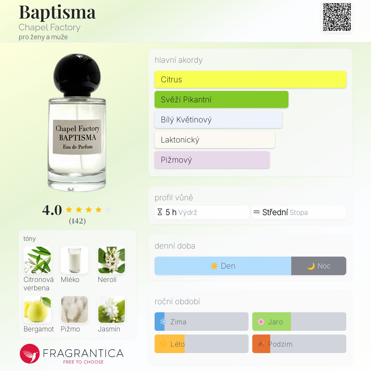 Baptisma podle Chapel Factory je Citrus vůně pro ženy a muže. Baptisma byl/a uveden/a v roce 2020. "Nosem" za touto vůní je Anais Biguine. Vrchní tóny jsou Sporýš, Bergamot a Zázvor; střední tóny jsouMléko, Neroli a Jasmín ; základní tóny jsou Bílé pižmo, Dubový mech a Kadidlo.