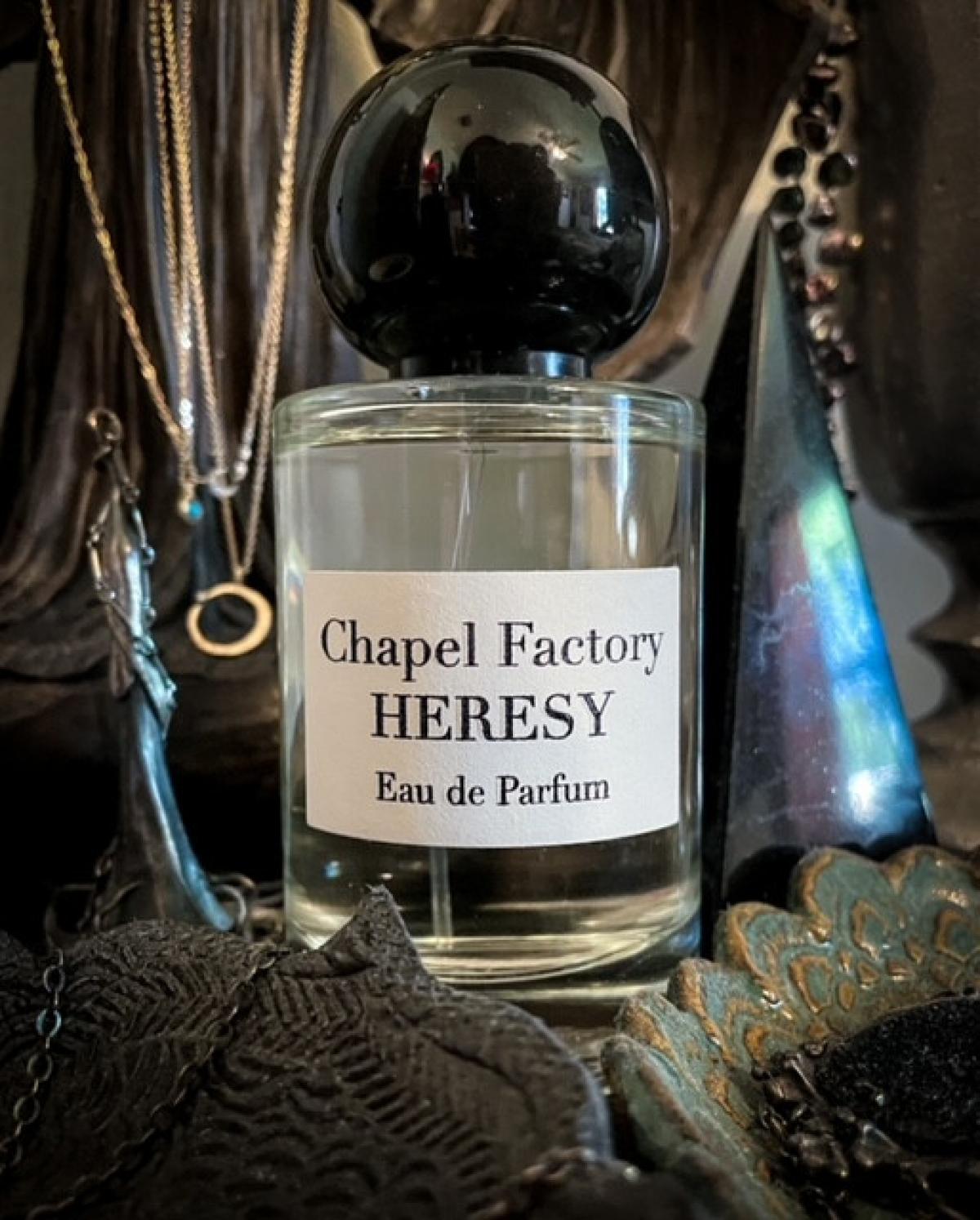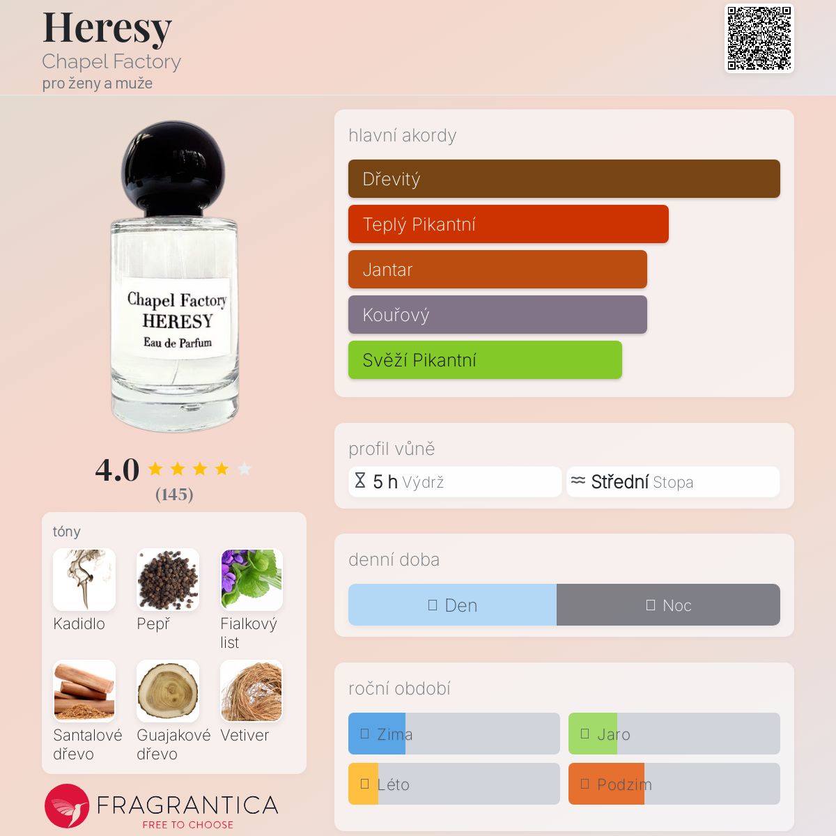 Heresy podle Chapel Factory je Woody vůně pro ženy a muže. Heresy byl/a uveden/a v roce 2020. "Nosem" za touto vůní je Anais Biguine. Vrchní tóny jsou Kadidlo a Černý pepř; střední tóny jsouFialkový list, Santalové dřevo a Cedr ; základní tóny jsou Guajakové dřevo, Vetiver a Pačuli.
