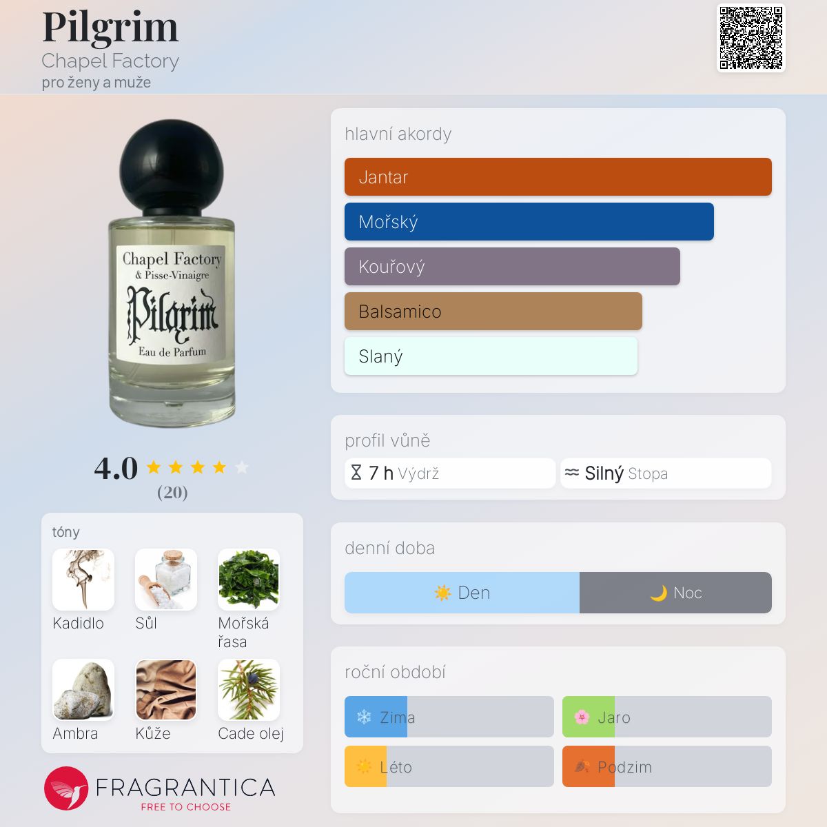 Pilgrim podle Chapel Factory je Woody Aquatic vůně pro ženy a muže. Toto je nová vůně. Pilgrim byl/a uveden/a v roce 2025. Pilgrim byl/a vytvořen/a Anais Biguine a Pisse-Vinaigre. Vrchní tóny jsou Kadidlo, Sůl a Cade olej; střední tóny jsouMořská řasa a Benzoin ; základní tóny jsou Ambra, Kůže a Mech.