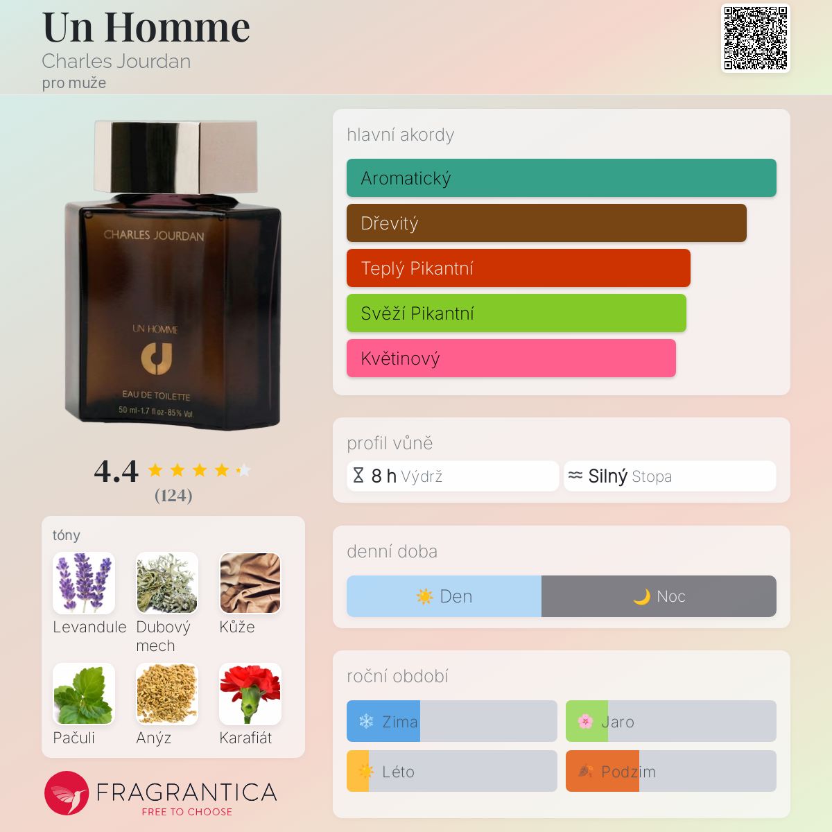 Un Homme podle Charles Jourdan je Aromatic Fougere vůně pro muže. Un Homme byl/a uveden/a v roce 1980. "Nosem" za touto vůní je Francoise Caron. Vrchní tóny jsou Levandule, Anýz, Estragon, Majoránka, Bergamot a Citrón; střední tóny jsouPačuli, Karafiát, Pelargónie, Jasmín, Brambořík a Cedr ; základní tóny jsou Dubový mech, Kůže, Santalové dřevo, Jantar (ambra), Pižmo a Fazole tonka.