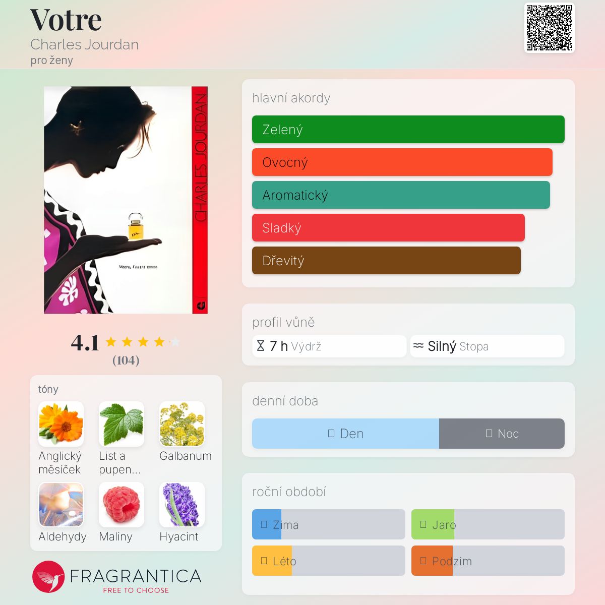 Votre podle Charles Jourdan je Floral vůně pro ženy. Votre byl/a uveden/a v roce 1978. "Nosem" za touto vůní je Jean-Louis Sieuzac. Vrchní tóny jsou Kasie, Galbanum, Aldehydy, Hyacint, Koření a Mandarinka; střední tóny jsouMěsíček, Švestka, Ylang-Ylang, Konvalinka, Růže a Jasmín ; základní tóny jsou Maliny, Santalové dřevo, Cedr, Jantar (ambra) a Pižmo.