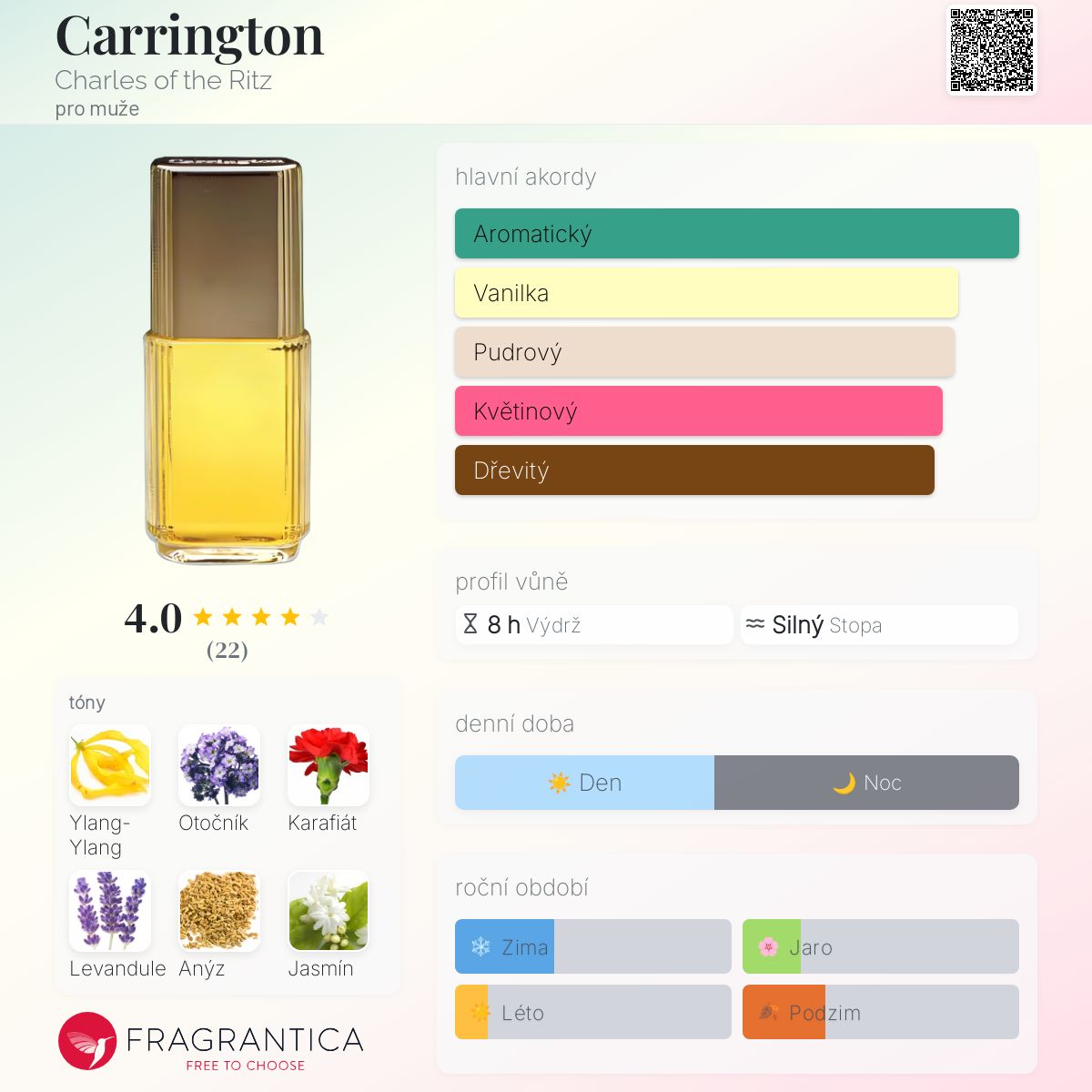 Carrington podle Charles of the Ritz je Orientální Fougere vůně pro muže. Carrington byl/a uveden/a v roce 1984. Vrchní tóny jsou Levandule, Anýz, Bergamot, Citron amalfi a Bazalka; střední tóny jsouYlang-Ylang, Karafiát, Jasmín, Pelargónie, Virginský cedr, Pačuli, Kapradina a Vetiver ; základní tóny jsou Otočník, Pižmo, Jantar (ambra), Vanilka, Dubový mech a Fazole tonka.