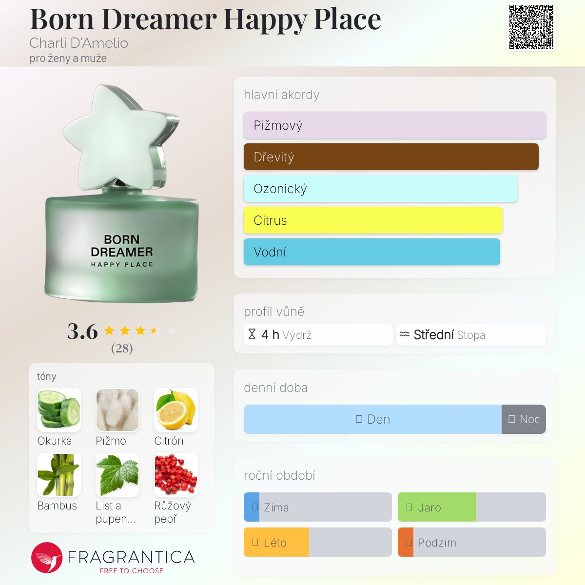 Born Dreamer Happy Place podle Charli D'Amelio je vůně pro ženy a muže. Born Dreamer Happy Place byl/a uveden/a v roce 2023. Vrchní tóny jsou Citrón, Černý rybíz a Růžový pepř; střední tóny jsouOkurka, Bambus a Fialka ; základní tóny jsou Pižmo a Santalové dřevo.