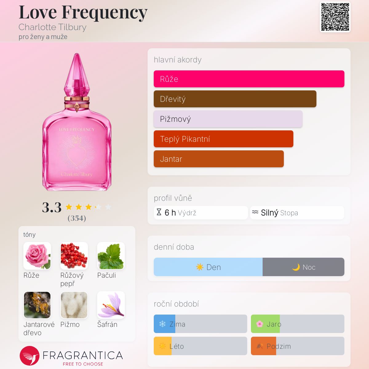 Love Frequency podle Charlotte Tilbury je Floral Woody Musk vůně pro ženy a muže. Toto je nová vůně. Love Frequency byl/a uveden/a v roce 2024. "Nosem" za touto vůní je Anne Flipo. Vrchní tón je Růžový pepř ; střední tóny jsouRůže a Šafrán ; základní tóny jsou Pačuli, Jantarové dřevo, Pižmo a Kašmírové dřevo.