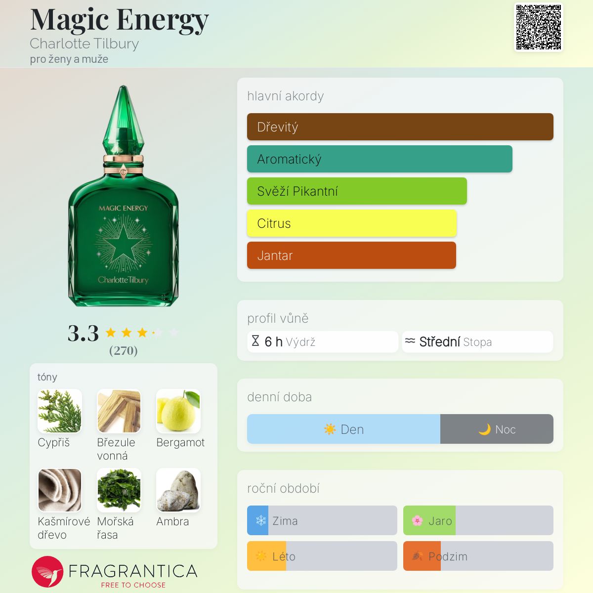 Magic Energy podle Charlotte Tilbury je Aromatic Aquatic vůně pro ženy a muže. Toto je nová vůně. Magic Energy byl/a uveden/a v roce 2024. "Nosem" za touto vůní je Juliette Karagueuzoglou. Vrchní tóny jsou Bergamot a Myrta; střední tóny jsouCypřiš, Mořská řasa a Jasmín Sambac ; základní tóny jsou Březule vonná, Kašmírové dřevo, Ambra a Kadidlo.
