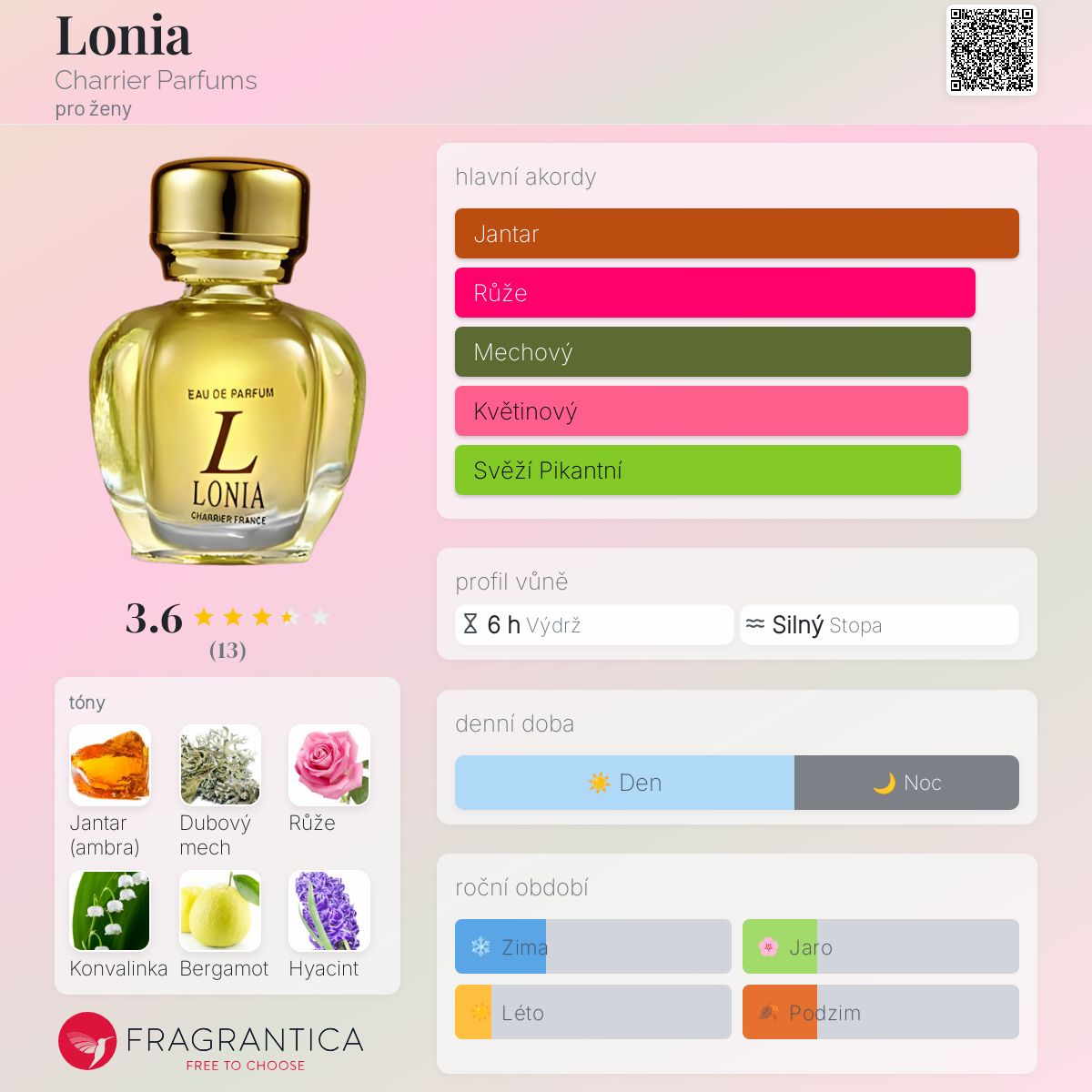 Lonia podle Charrier Parfums je Chypre Floral vůně pro ženy. Vrchní tóny jsou Bergamot, Hyacint, Pelargónie a Hloh; střední tóny jsouRůže, Konvalinka, Fialka a Mimóza ; základní tóny jsou Jantar (ambra), Dubový mech, Santalové dřevo a Cedr.