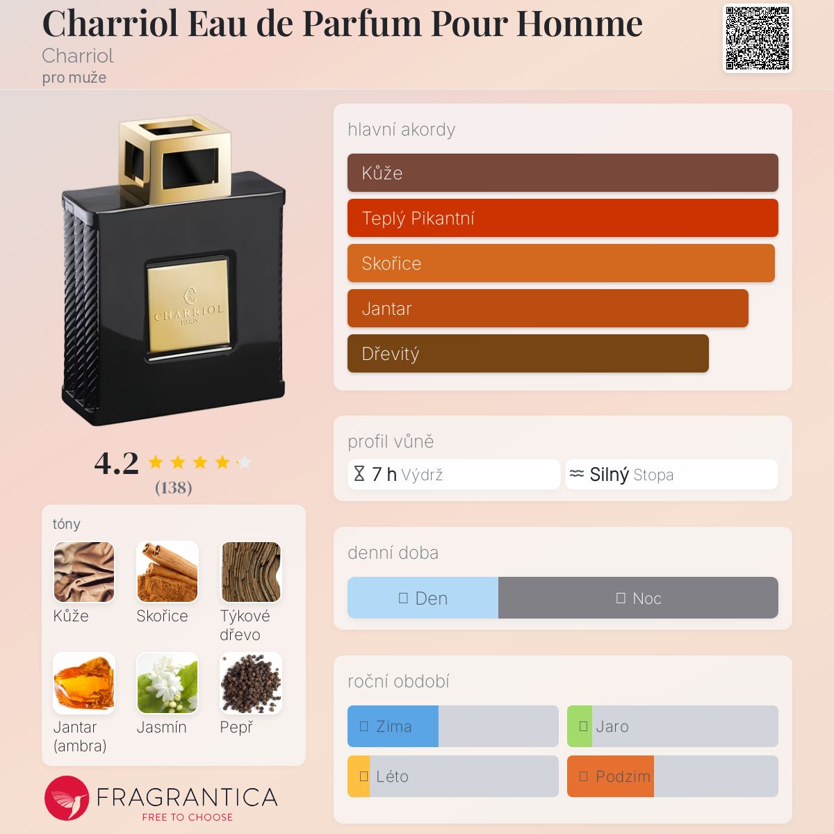 Charriol Eau de Parfum Pour Homme podle Charriol je Orientální Woody vůně pro muže. Charriol Eau de Parfum Pour Homme byl/a uveden/a v roce 2010. Vrchní tóny jsou Skořice a Černý pepř; střední tóny jsouKůže a Jasmín ; základní tóny jsou Týkové dřevo a Jantar (ambra).