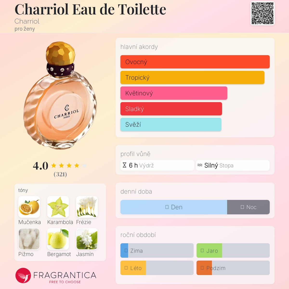 Charriol Eau de Toilette podle Charriol je Floral Fruity vůně pro ženy. Charriol Eau de Toilette byl/a uveden/a v roce 2008. "Nosem" za touto vůní je Philippe Bousseton. Vrchní tóny jsou Mučenka, Karambola a Bergamot; střední tóny jsouFrézie a Jasmín ; základní tóny jsou Pižmo, Týkové dřevo a Vetiver.